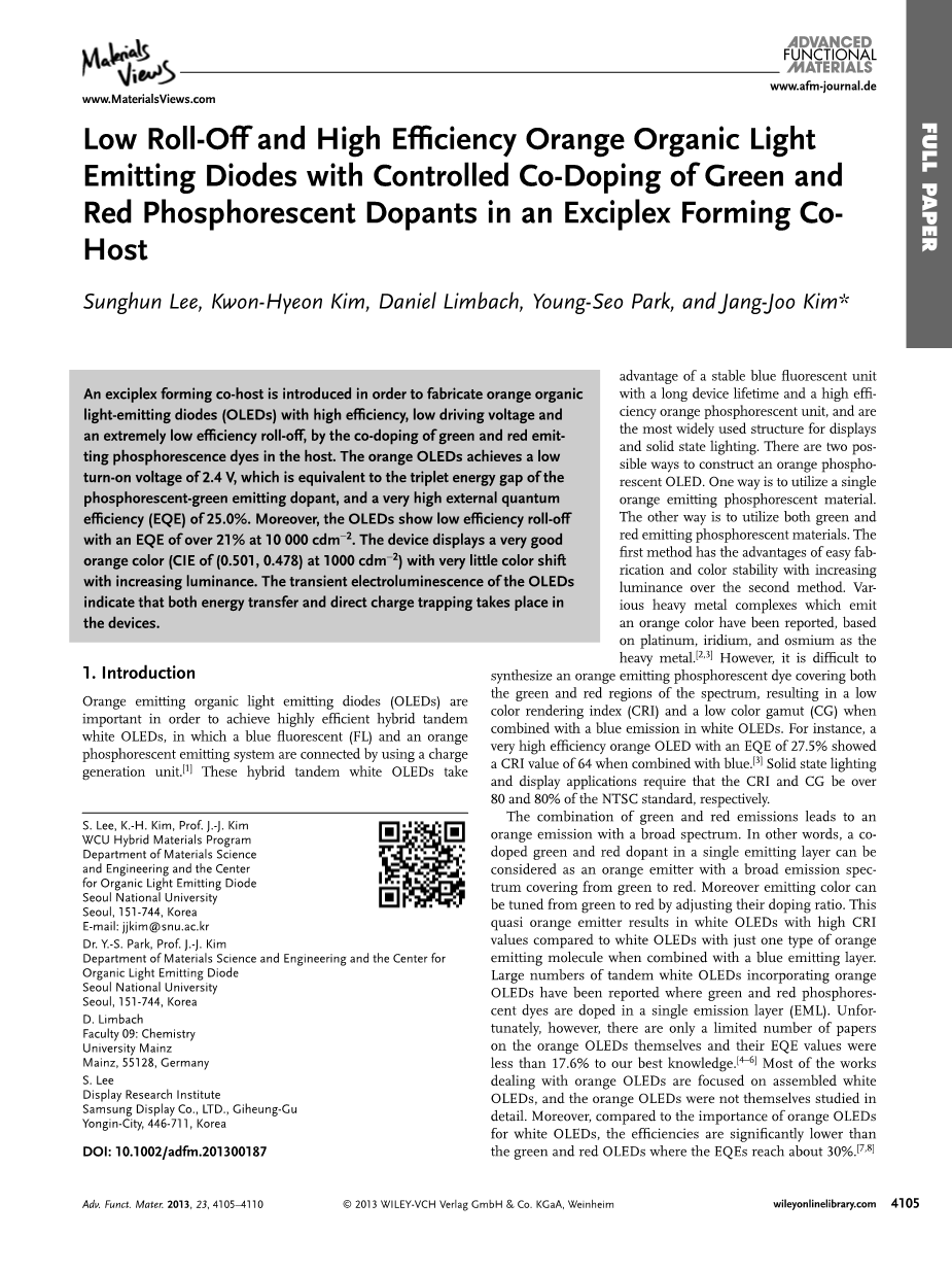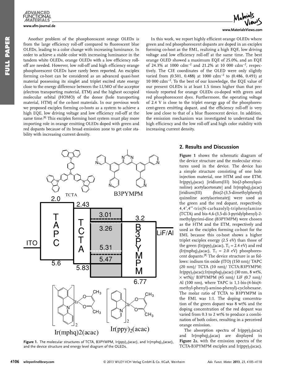 在激基复合物主体中控制和掺杂绿色和红色磷光掺杂剂形成低滚降和高能量的橙光发光二管外文翻译资料
