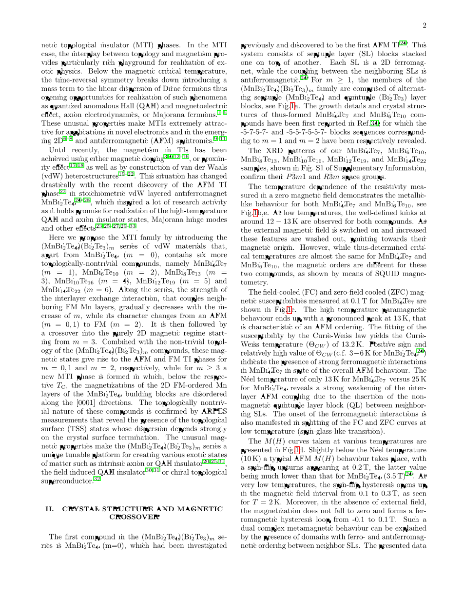 在这里,我们通过引入(MnBi2Te4)(Bi2Te3)m系列vdW材料来提出磁性拓扑绝缘体族,除了MnBi2Te4(m=0),它还包含六个拓扑非平庸的化合物,即MnBi4Te7(m=1)、MnBi6Te10(m=2)、MnBi8Te13(m=3),MnBi10Te16(m=4),MnBi12Te19(m=5)和MnBi14Te22(m=6)。随着m的增加,层间交换作用的强度逐渐降低,其特征由反铁磁(m=0,1)变为铁磁性(m=2)。然后,从m=3开始进入纯二维磁区。结合(MnBi2Te4)(Bi2Te3)m化合物的非平凡拓扑结构,这些磁态分别在m=0,1和m=2时产生a 铁磁和铁磁-TI相,而在mge;3时形成一个新的磁性拓扑绝缘相,其中在相应的临界温度下,MnBi2Te4构件的二维铁磁有序Mn层的磁化沿[0001]方向是无序的。这些化合物的拓扑非平凡性质通过ARPES测量得到证实,ARPES测量揭示了拓扑表面态(TSS)的存在,其色散强烈依赖于晶体表面的终止。这种不寻常的磁性使(MnBi2Te4)(Bi2Te3)m系列成为一个独特的可调谐平台,可用于创造各种奇异的物质状态,如本征轴子或量子反常霍尔效应绝缘材料、场致量子反常霍尔效应绝缘材料或手性拓扑超导体