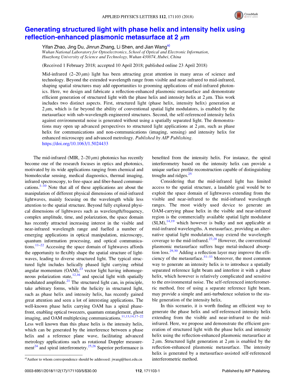 近年来,人们对于中红外波段(2-20mu;m)光学及光集成芯片表现了很大的兴趣。从可见光到近红外甚至中红外的较宽波长范围内,塑造空间结构能极大增加中红外光子学的应用机会。在这里,我们设计并制备了一种片上反射增强型超表面结构,并利用该器件在2mu;m波段产生了具有相位螺旋和强度螺旋的结构光。首先,利用亚波长工艺结构超表面,在2mu;m波段产生了结构光,大大超过了传统结构光调制的能力;其次,在不使用空间分离光的情况下,产生了抑制环境噪声的自干涉强度螺旋。该研究可能带来结构光在2mu;m波段的广泛应用,如用于通信和非通信(成像、传感)的相位螺旋,以及用于增强显微效果和精密测量的强度螺旋。