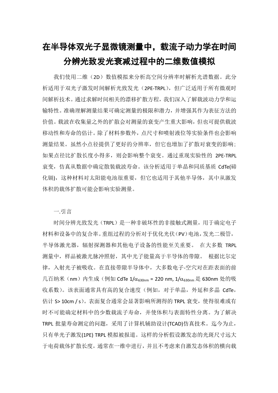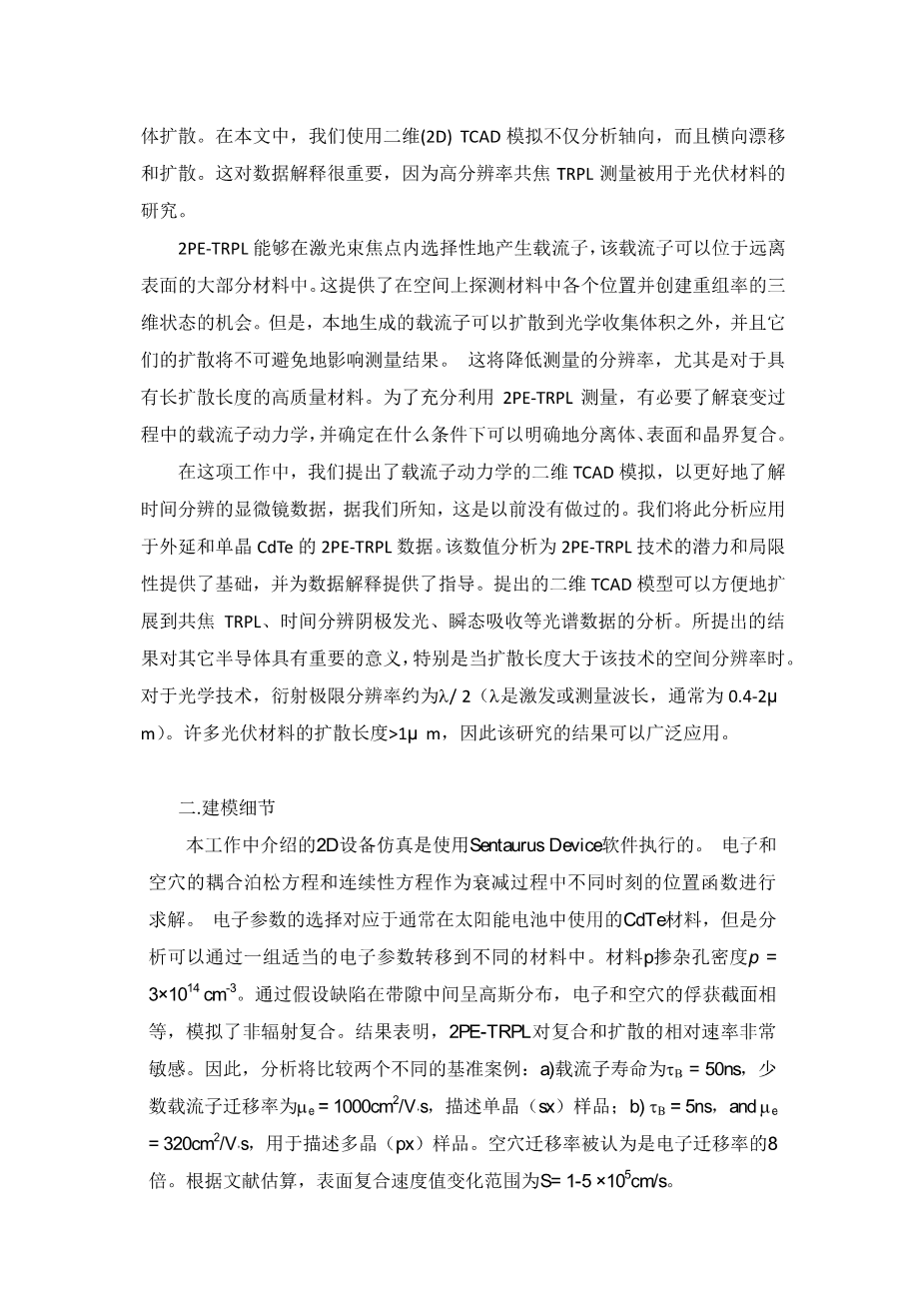 在半导体双光子显微镜测量中,载流子动力学在时间 分辨光致发光衰减过程中的二维数值模拟外文翻译资料 2022-08-10 16:03:38 英语原文共 28 页,剩余内容已隐藏,支付完成后下载完整资料 英语译文共 11 页,剩余内容已隐藏,支付完成后下载完整资料 资料编号:[238422],资料为PDF文档或Word文档,PDF文档可免费转换为Word 原文和译文剩余内容已隐藏,您需要先支付 30元 才能查看原文和译文全部内容!立即支付 发小红书推广免费获取该资料资格。点击链接进入获取推广文案即可: Ai一键组稿 | 降AI率 | 降重复率 | 论文一键排版 PREVIOUS NEXT 您可能感兴趣的文章 多腔金属-介质滤波器外文翻译资料 斜率效率59.80%的高效的Nd∶YAG陶瓷连续激光器外文翻译资料 溶胶-凝胶法制备高透明纳米结构TiO2薄膜外文翻译资料 喷射冷却金属簇的腔环染色激光光谱: Cu2和Cu3外文翻译资料 有机-无机卤化铅的合成钙钛矿纳米片:寻求高性能钙钛矿太阳能电池和光电子器件外文翻译资料 单位圆的正交多项式向量, 第二部分:完成基组外文翻译资料 LED显示器的设计与应用外文翻译资料 基于SURF的视频图像拼接技术研究外文翻译资料 广州市区相对湿度和粒径分布对气溶胶消光性的影响外文翻译资料 Cr 4 :YAG被动调Q的脉冲Nd: YAG激光器外文翻译资料
