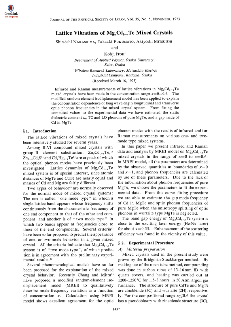 对于混合晶体系统的正常模式,通常可观察到两种类型的行为:一种被称为“一种模式类型”,其中出现一个单晶格带,其频率从一端组件的特征频率连续移动到另一端组件的特征频率;另一种称为“两种模式类型”,其中两个波段出现在靠近终端部件的频率处。到目前为止,已经提出了几种标准来预测给定混合晶体中单模或双模行为的出现。所有标准均表明MgxCd1-xTe系统为“双模型”,其预测结果与初步实验结果一致。