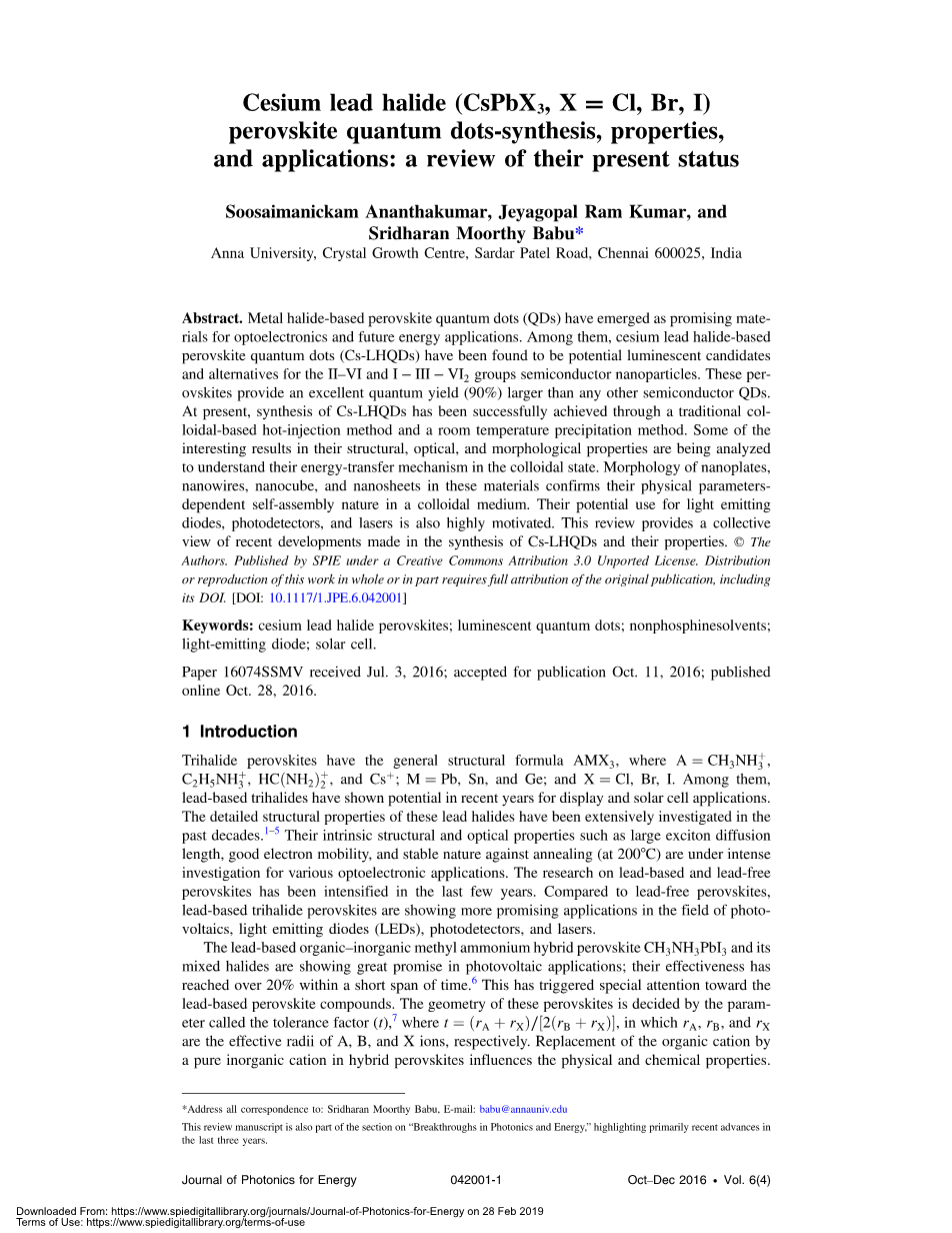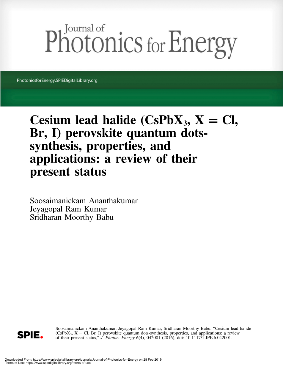 摘要:金属卤化物钙钛矿量子点(QDs)已成为光电子学和未来能源应用的有前景的材料。其中,基于铅钙钛矿铯卤化物量子点(CS-LHQDs)已经被认为是发光的潜在候选人,并为II-VI和I-III-VI2半导体纳米颗粒的替代品。这些钙钛矿提供比任何其他半导体QDs更好的量子产率(90%)。目前,通过传统的胶体基热注入法和室温沉淀法成功地实现了Cs-LHQDs的合成。正在分析其结构,光学和形态特性的一些有趣结果,以了解它们在胶体状态下的能量转移机制。这些材料中纳米片,纳米管,纳米立方体和纳米片的形态证实了它们在胶体介质中的物理参数依赖性自组装性质。它们对发光二极管,光电探测器和激光器的潜在用途也很有动力。该综述提供了对Cs-LHQDs合成及其性质的最新发展的集体观点。