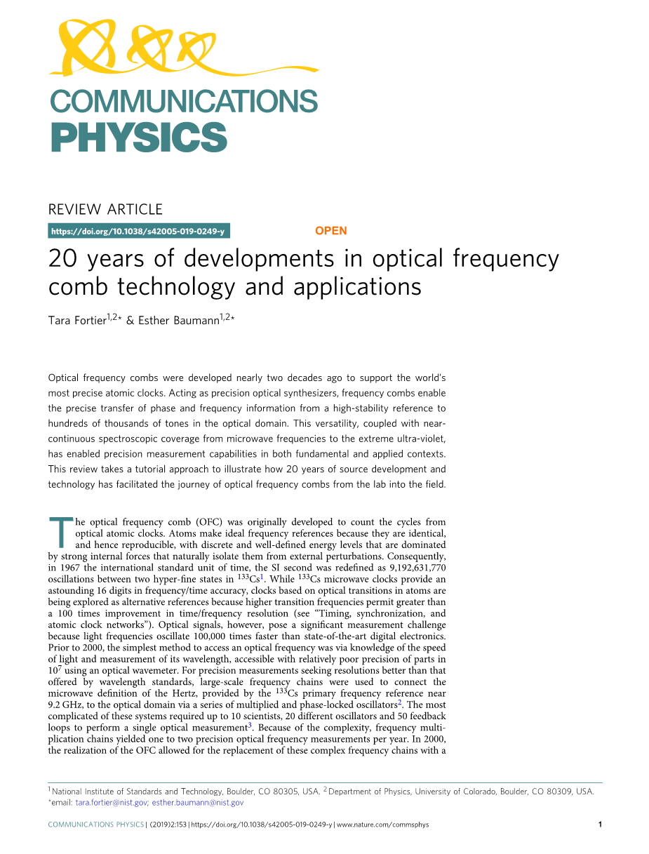 光学频率梳是近二十年前开发的,旨在支持全世界最精确的原子钟。频率梳可以将高稳定性参考源的相位和频率信息精确传递到光域中数以千百计的频率,从而可以充当精密光学合成器。这种多功能性以及从微波频率到极紫外光谱的近乎连续的光谱覆盖范围,在基础和应用环境中具备精密测量的能力。这篇综述采用了一种教程式的方法来说明20年的技术发展促进了光频率梳从实验室到实地应用。
