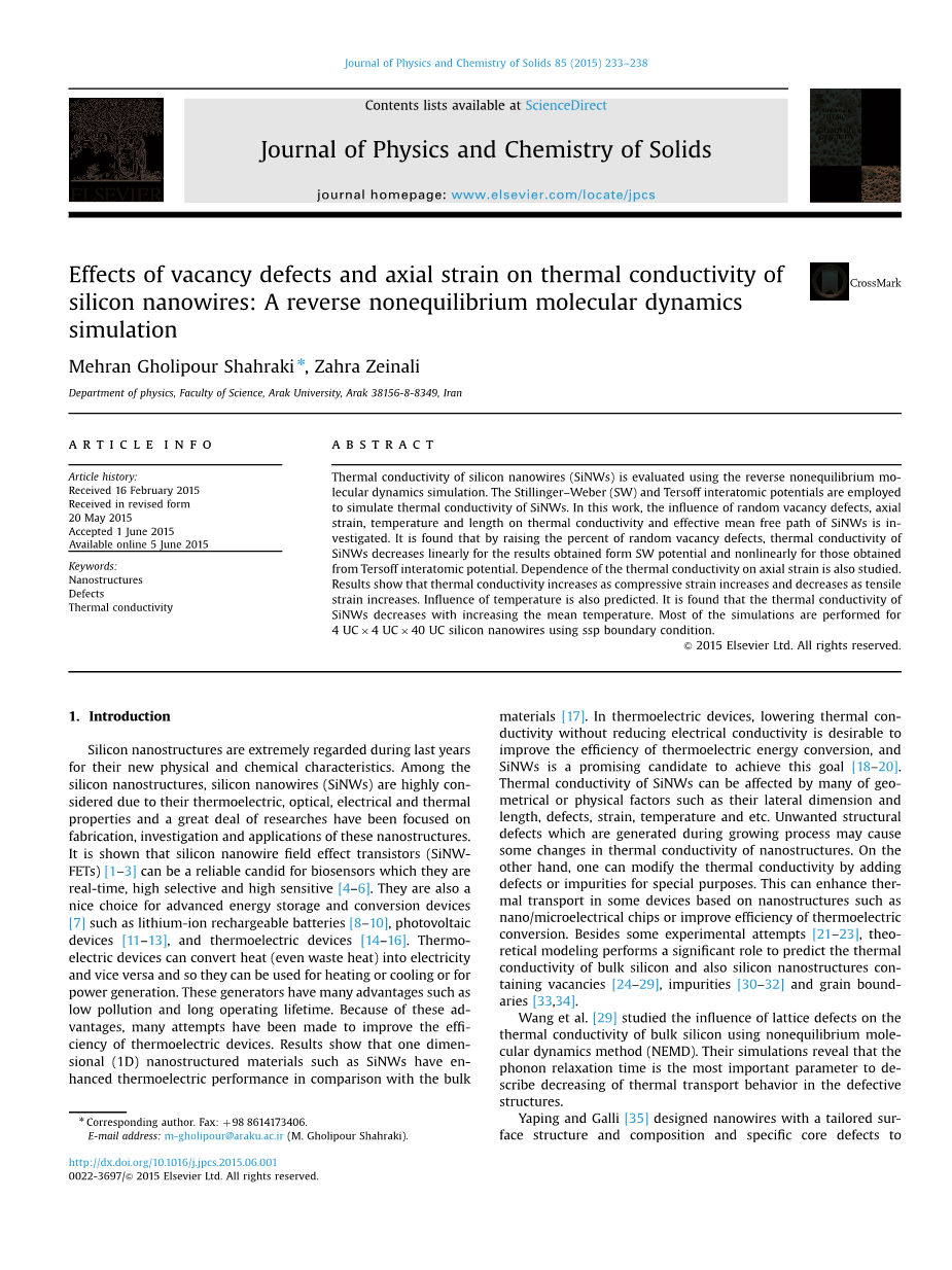 硅纳米结构在过去几年因其新颖的物理和化学特性而倍受重视。其中硅纳米线受到高度重视,这是因为其独特的热电、光学、电学和热学性能以及现有的大量的研究都集中在这种纳米线结构的制备、研究与应用上。结果表明,硅纳米线场效应晶体管(SiNWFETs)[1-3]能够成为一个具有实时,高选择性和高灵敏度等优点的可靠的生物传感器[4-6]。硅纳米线也常应用于先进的能源存储和转换设备中[7],例如:锂离子充电电池[8-10],光伏设备[11-13]和热电器件[14-16]。其中热电器件可以将热能(甚至废热)转换成电能,反之亦然,因此它们可用于加热或制冷或用于发电。其中热电发电机有许多优点,如低污染和长寿命。基于这些优点,我们已经作出了许多尝试,以提高热电器件的效率。结果表明,一维(1D)的纳米材料,例如硅纳米线,与基体材料相比,热电性能更加突出[17]。在热电器件中,降低热导率而不降低电导率是提高其热电转换效率的一种可行的方法,而硅纳米线极有希望实现这一目标[18-20]。硅纳米线的导热系数会受许多几何或物理因素的影响,例如横向尺寸,长度,缺陷,应变,温度等。在生长过程中产生的缺陷可能会导致纳米结构热导率的一些变化。另一方面,可以通过添加特殊用途的缺陷或杂质来修改其热导率。这可以提高一些以纳米结构(如纳米/微芯片)为基础的设备的热传输,或提高其热电转换效率。除了一些实验的尝试[21-23],理论建模在预测体硅和含有空缺[24-29],杂质[30-32]和晶界[33,34]的硅纳米结构热导率方面起到了至关重要的作用。