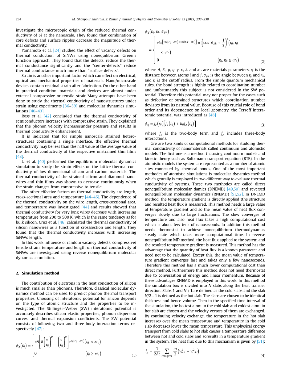 电子在硅热传导中的贡献比声子小得多。因此,经典分子动力学方法可以用来预测声子热输运性能。硅原子间相互作用势的选择取决于原子结构的类型和待研究的性质。Stillinger -Weber(SW)原子间相互作用势准确的描述硅弹性性质、声子色散曲线和热膨胀系数。SW势由以下两个和三个身体相互作用项分别[47]:
