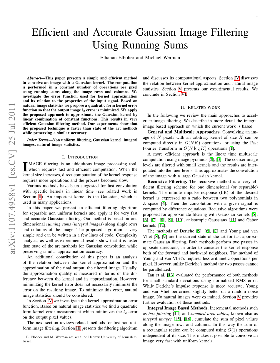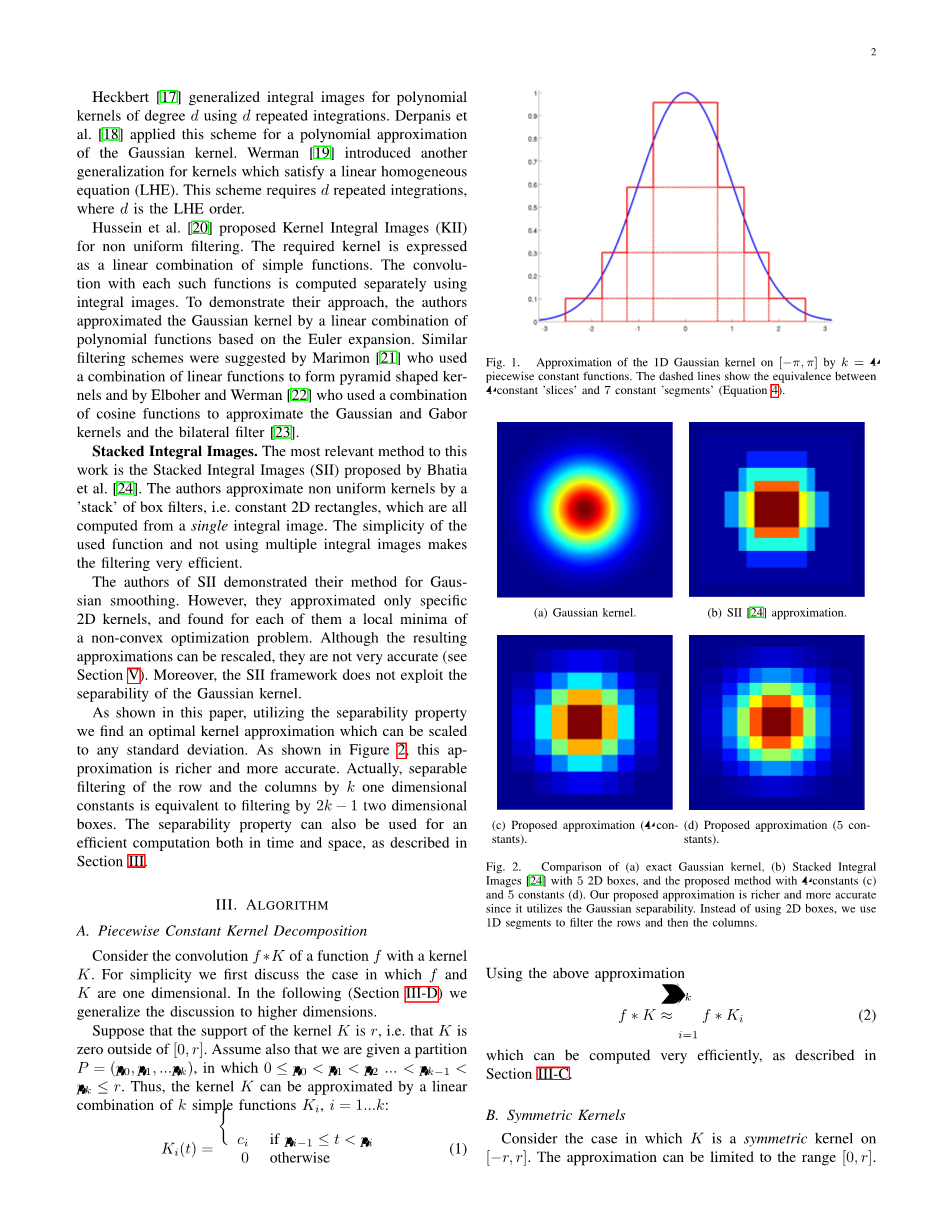 叠加积分图像。这个工作最相关的方法是Bhatia提出的叠加积分图像(SII)。作者通过叠加一个方块过滤器近似非均匀内核,即不变的二维矩形,这是所有从一个单一的整体形象计算。简单的使用的功能和不使用多个积分图像使得过滤效率很高。SII作者证明他们的方法对高斯积分的平滑。然而,他们只近似特殊的二维核,并发现为每个它们的局部极小非凸优化问题。虽然由此产生的近似结果可以重新调整,但他们是不准确的(见第五节)。此外,SII框架没有利用高斯内核的可分性。在本文中,利用可分性我们找到一个最佳的内核近似,可以缩放任何标准偏差。如图2所示,这种近似结果是更丰富、更准确。实际上,可分离的行和列K的一维过滤常数相当于2K -1二维盒。可分性特性也可用于有效的计算时间和空间,如在第三节描述的。