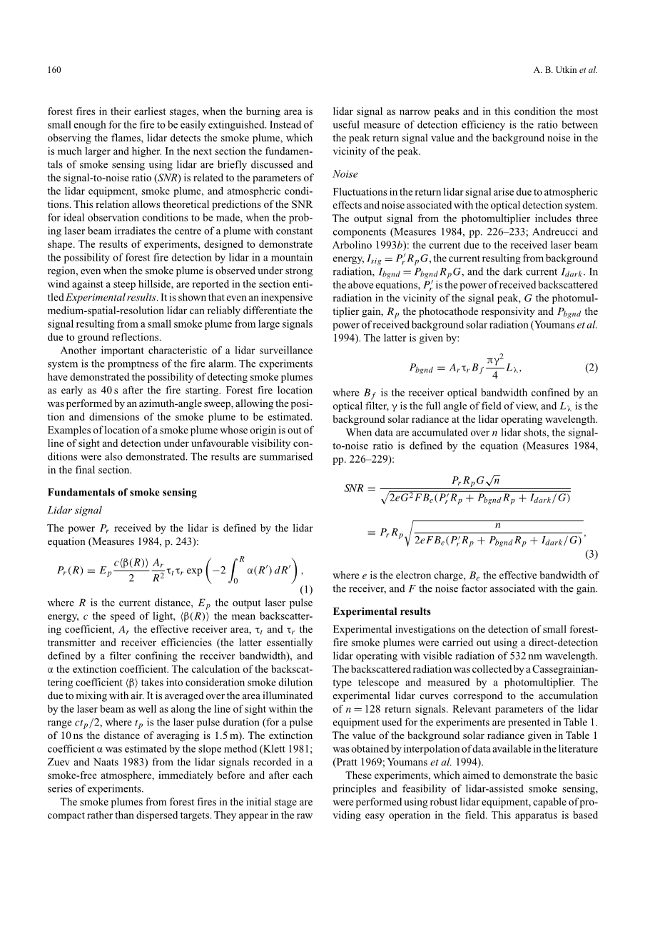 使用直径为波长的可见光辐射的直接检测激光雷达进行小型森林火焰烟雾检测的实验研究。背散射辐射由卡塞格朗型望远镜收集,并由光电倍增管测量。实验激光雷达曲线对应于个返回信号的累积。用于实验的激光雷达设备的相关参数如表1所示。表1给出的背景太阳辐射的值是通过对文献中可获得的数据进行插值得到的(Pratt 1969; Youmans等,1994)。