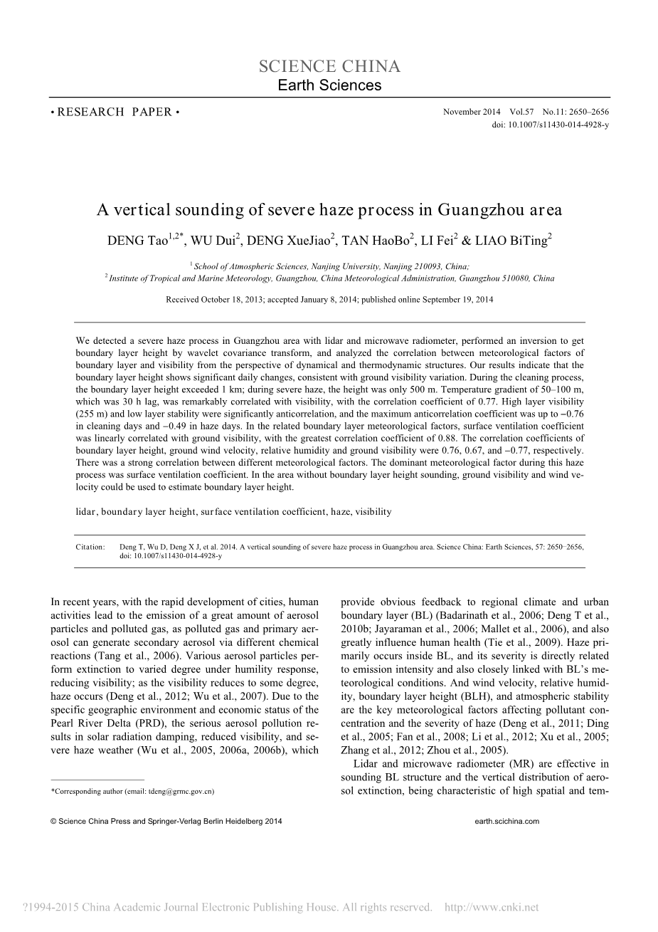 在广州地区一次严重的阴霾天气中,我们用激光雷达和微波辐射计进行检测,然后通过小波协方差变换对边界层高度进行分析,并从动力学和热力学结构的角度分析气象因子间的边界层和能见度,然后进行反演。我们的研究结果表明,边界层高度显示的每日变化,与地面能见度变化相一致。在清洗过程中,边界层高度超过1公里,在严重的阴霾情况下,高度只有500米的温度梯度为50,100米,这是30小时滞后,显着相关的能见度,与相关系数为0.77。高层的可见性(255米)和低层稳定性显著负相关,与最大负相关系数高达0.76minus;在清洁日和0.49minus;雾霾天。在相关边界层气象因子中,表面通风系数与地面能见度呈线性相关,最大相关系数为0.88。相关系数边界层高度、地面风速、相对湿度、地面能见度分别为0.76、0.67、0.77和minus;,分别。不同气象因子间存在较强的相关性。在此期间,占主导地位的气象因子过程是表面通风系数。在无边界层高度测深,地面能见度和风—速度可以用来估计边界层高度。