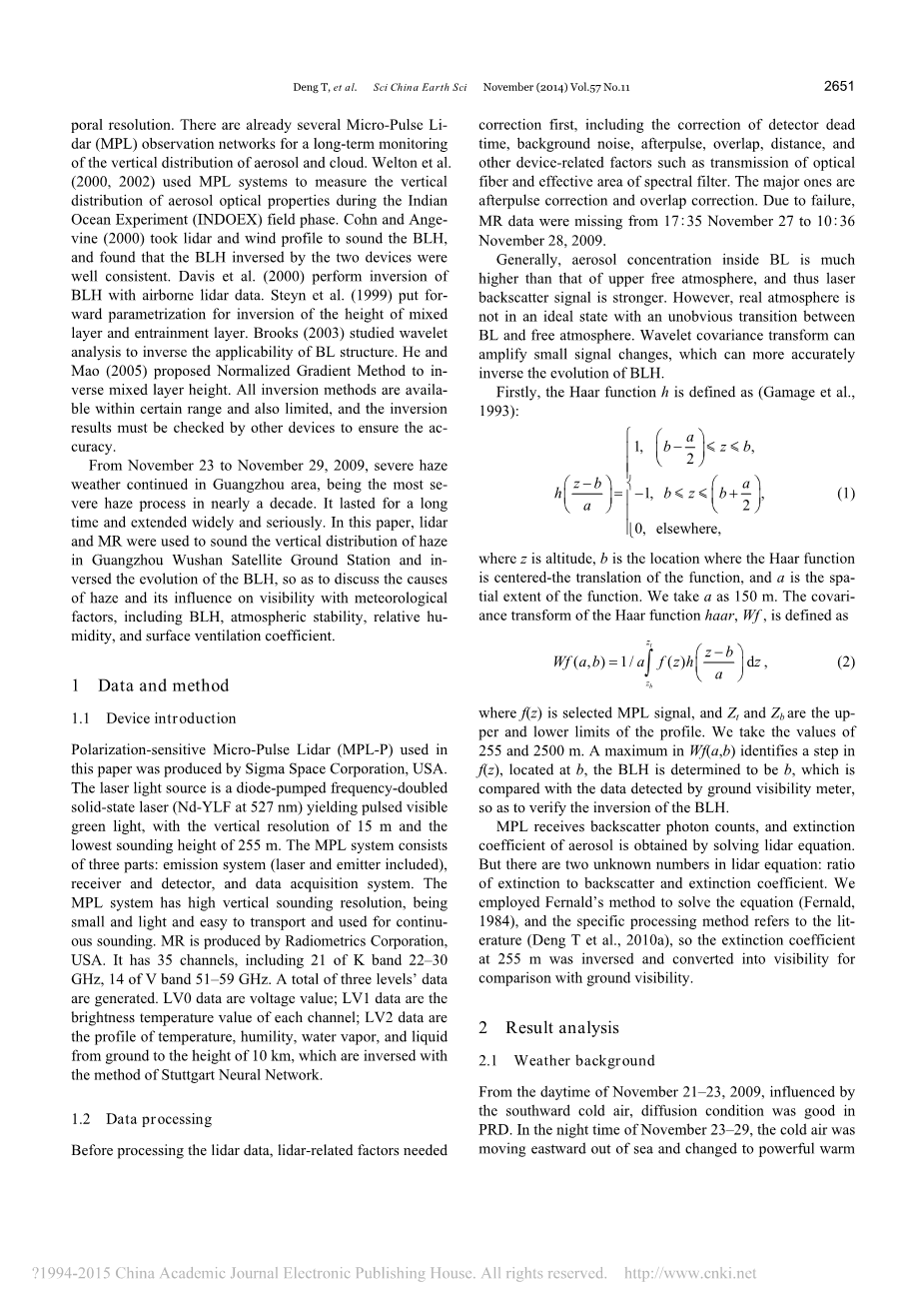 在处理激光雷达数据之前,激光雷达相关的因素需要校正,包括探测器的修正时间、背景噪声、脉冲、重叠,距离,和其他设备相关的因素,如光传输光纤和频谱滤波器的有效面积。主要的是校正后的校正和重叠。由于故障,我们丢失了2009年11月27日11点至11月28日十点的数据。一般来说,边界层的气溶胶浓度高于自由大气,从而激光后向散射信号强。然而,真正的氛围是不在一个理想的状态之间,BLd 过渡不明显,而且范围很小。小波变换能放大小信号的变化,从而更准确逆BLH的演变。首先,Haar函数H的定义是: