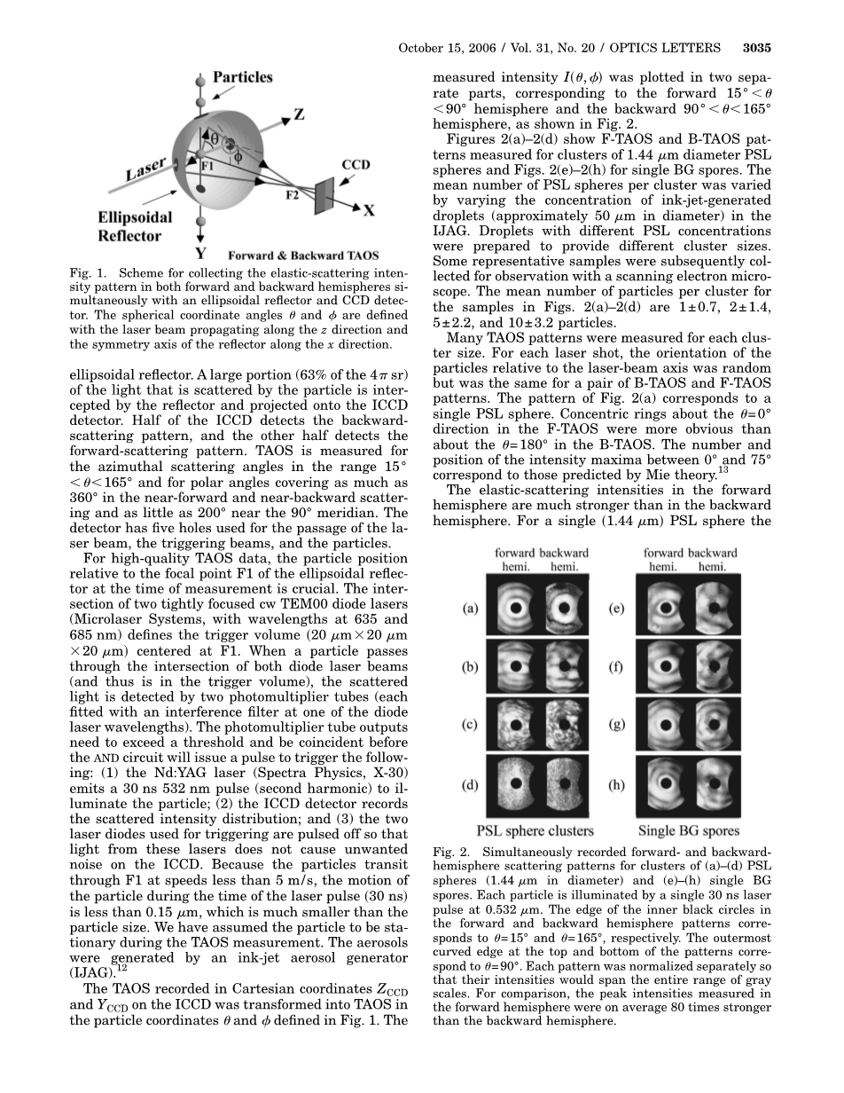 用椭球反射罩和增强型CCD探测器从前半球15 ° lt; 0 lt; 90°和后半球90 ° lt; 0 lt; 165°同时测量气溶胶的二维角光学散射(检测63%4u sr的散射光)。TAOS模式自聚苯乙烯乳胶球(单体和聚集体)和单芽孢杆菌芽孢中取得。这些信息丰富的模式,采用了单脉冲激光测量飞行的单体颗粒,表明前TAOS和后TAOS的测量可用于单个气溶胶粒子的快速分类。2006美国光学学会。