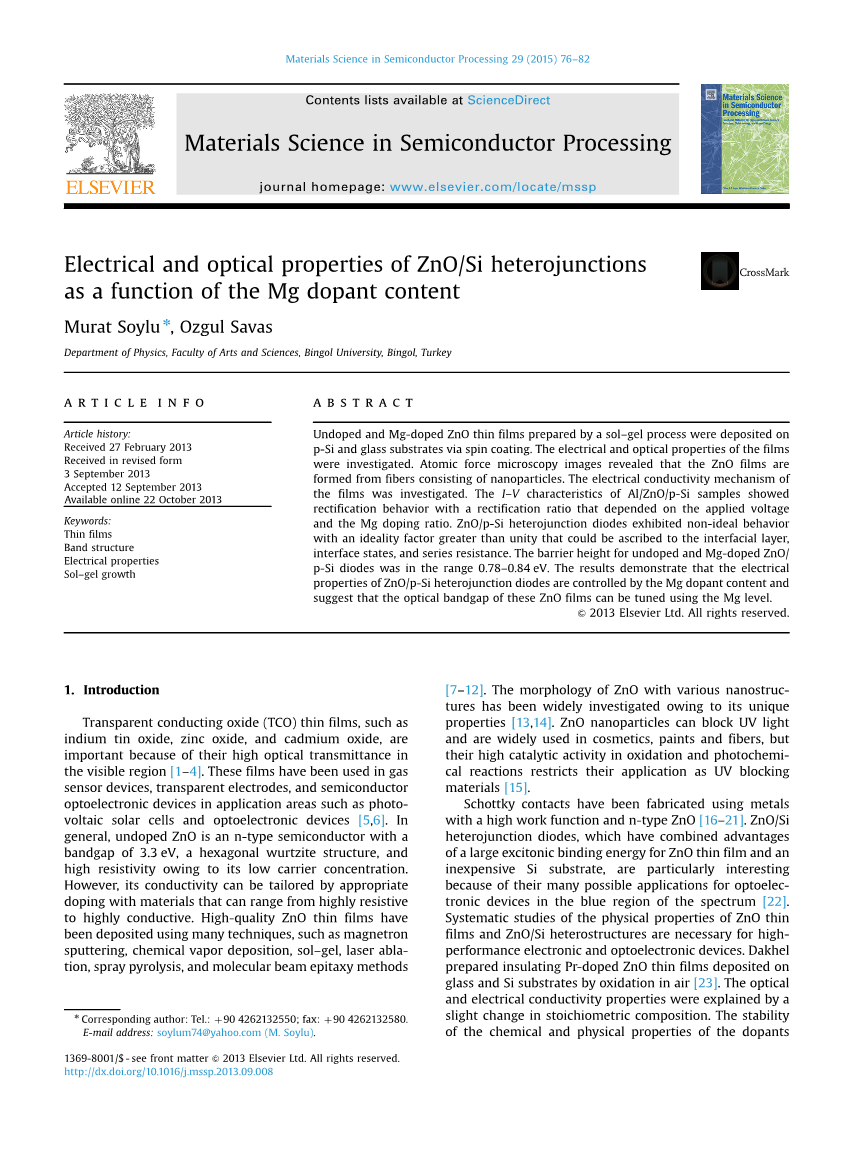 ZnO/p-Si异质结二极管用一个理想因素大于整体表现出非理想的的行为可以归因于界面层,界面状态和串联电阻。无掺杂和镁掺杂的ZnO/p-Si二极管的势垒高度在0.78—o.84ev范围内。实验结果表明,ZnO/p-Si异质结二极管的电学特性可由镁掺杂量控制并且表明可以使用镁的水平调整这些氧化锌薄膜的光学带隙。