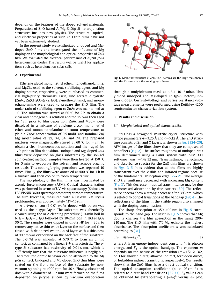 使用金属制备的肖特基接触具有高功函数和n型氧化锌【16,21】。氧化锌/硅异质结二极管特别有趣,有一个大的激子结合能的ZnO薄膜和廉价的硅衬底,具有综合优势。因为他们的许多可能的应用的光电子器件在光谱的蓝色区域【22】。系统的研究氧化锌薄膜和氧化锌/硅异质结的物理性质对于高性能的电子和光电子设备是必须的。Dakhel 制备绝缘掺杂的氧化锌薄膜沉积在玻璃和硅衬底上在空气中氧化【23】。用化学计量组合物的轻微变化解释其光学和导电性能。掺杂剂的化学和物理性能的稳定性取决于掺杂溶胶-凝胶材料的特性。制备以氧化锌为衬底的掺杂Al/Mg的ZnO/Si异质结结构包含有新物理。这种氧化锌薄膜的结构,光学和电学性能还没有被广泛研究。