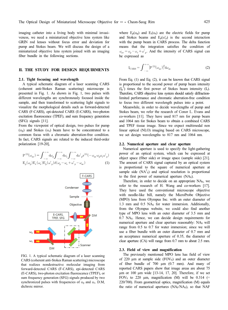 为了生成汽车信号,我们必须使用两个激光脉冲频率的omega;p泵浦光和斯托克斯omega;s量。可以说,汽车信号生成有效的共线激发几何与泵之间的紧密聚焦,没有时间延迟(omega;p)和斯托克斯量(omega;s)。omega;p-omega;s,如果频率不同,匹配分子特定频率共鸣的,蓝移和强烈的汽车在omega;AS = 2omega;p-omega;s发出信号。从这个汽车信号中,得到了亚微米分辨率的三维无标签图像。在目前报道的汽车显微镜中,使用的是传统的显微镜物镜,因此它们在进入活体时受到限制。梯度指数(GRIN)镜片可能是体内导管植入的一种解决方案。然而,由于固有的大量的色差,GRIN镜头不能利用集中两个脉冲的频率omega;p和omega;s点。为了插入汽车微型显微镜物镜的光学设计,我们需要一种微型物镜系统,如GRIN物镜,在泵浦和斯托克斯光束时没有聚焦误差和偏差。我们将在以下几节中讨论与成像纤维束连接的微型物镜系统的设计。