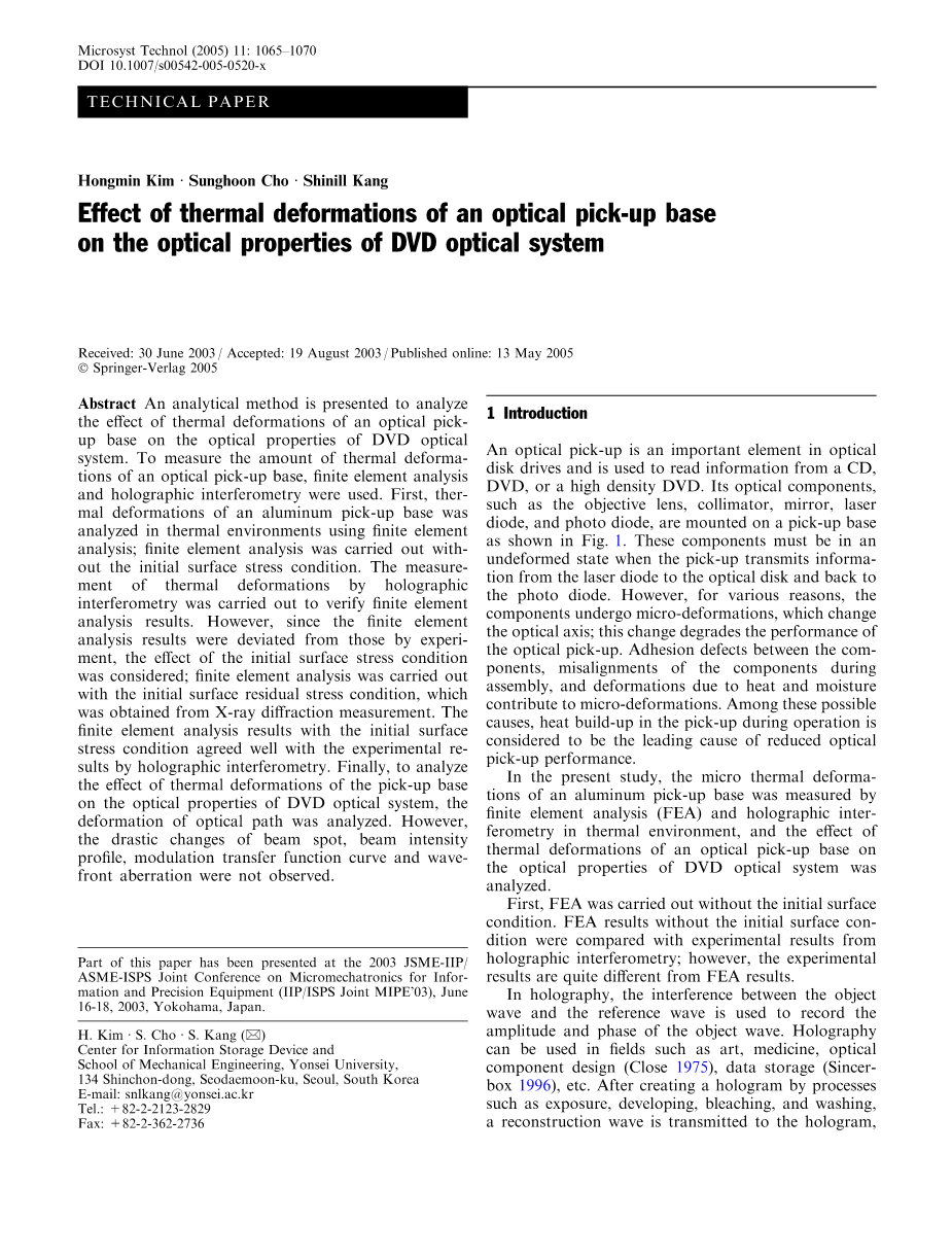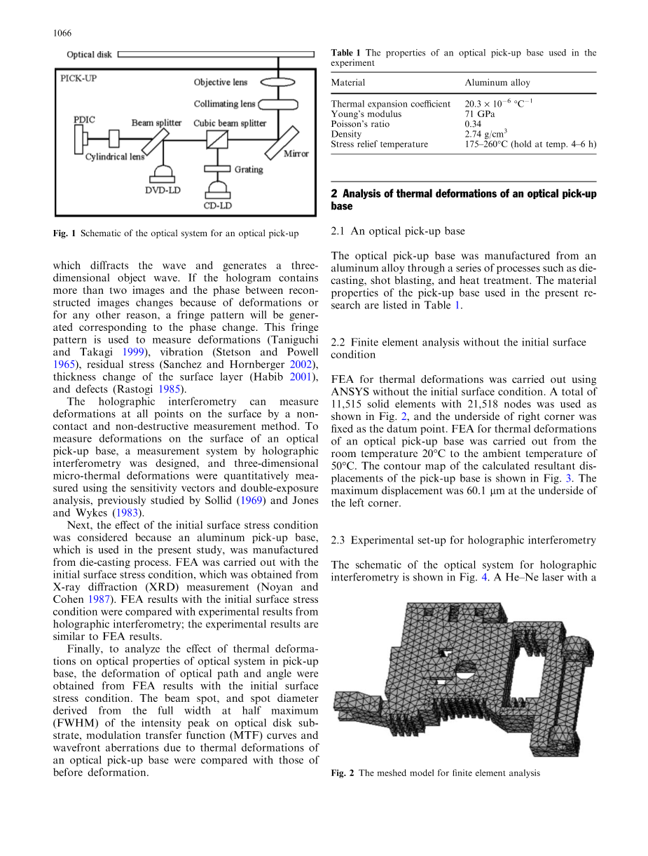 在本研究中,通过热环境中的有限元分析(FEA)和全息干涉测量法测量铝基座的微热变形,并且光学读取基座的热变形对光学性能的影响DVD光学系统进行了分析。