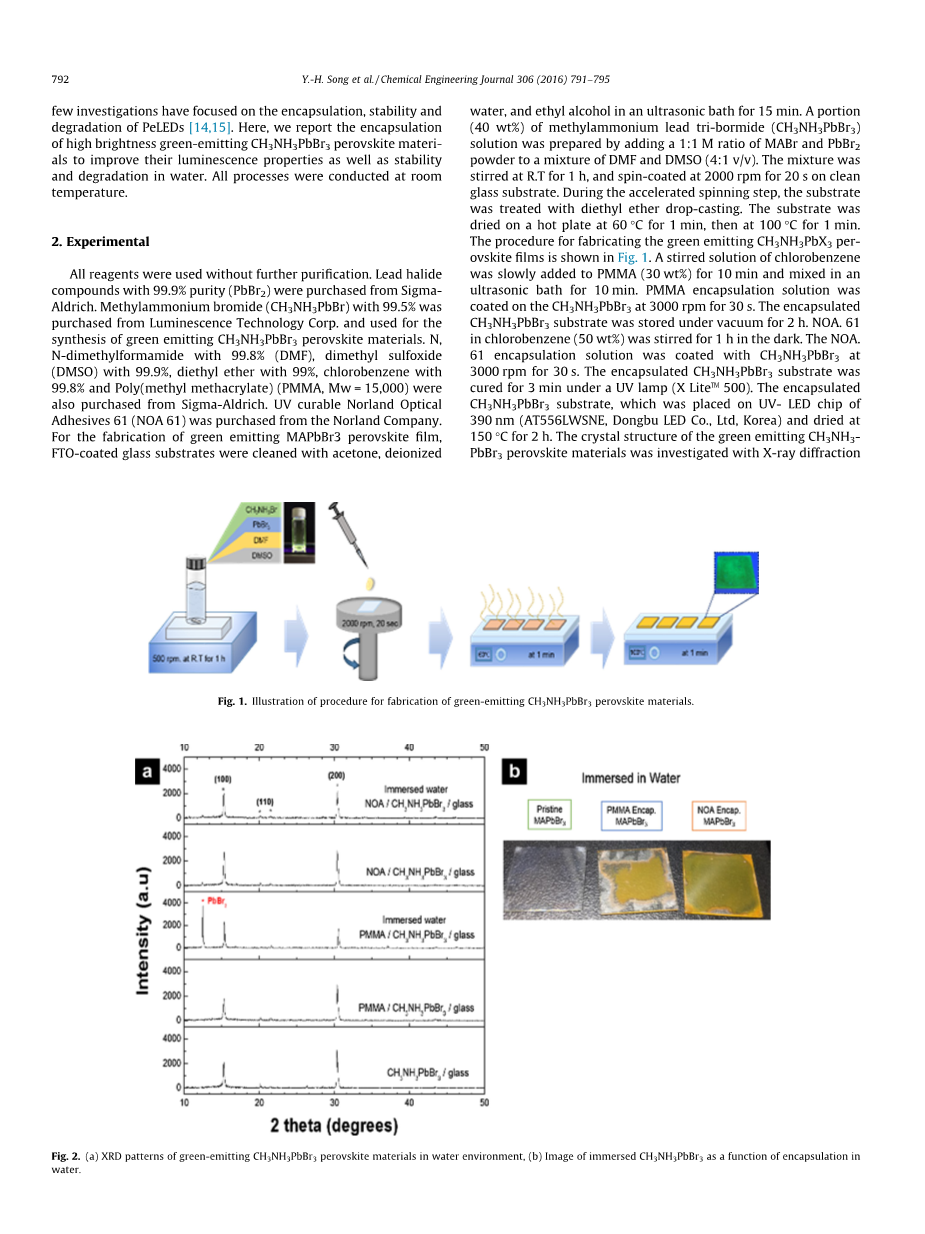 金属卤化物钙钛矿材料已经坚定地成为了一种最有前途的太阳能电池板材料由于它们卓越的20%的光电转换效率。这些材料有优秀的表现如高的吸收系数,平衡的电子-空穴迁移率,长的激子扩散长度和相对低的合成温度要求。钙钛矿太阳能电池已经被集中地研究应用在发光二极管的白光产生方面。白色发光二极管的标准样式由带有在硅树脂中黄色发光的Y3Al5O12: Ce3 磷光剂的氮化铟镓蓝色发光二极管组成并且最理想的光谱和太阳光谱不同。最近,胶体的量子点由于其明亮的发光特性,高的电荷载体迁移率和带有基于在展示应用方面整个范围宽色彩背光的颜色可调谐性的狭窄的发射光谱带。尽管量子点有这么多优点,由于缺少廉价材料商品化仍然很困难。通过在发光二极管中使用钙钛矿材料,量子点的限制可以被忽略。CH3NH3PbX3的电子结构有一个钙钛矿结构,归因于X的p轨道和铅的p轨道。因此,这种材料的带隙可以通过X的p轨道被调整以应用在发冷光的材料中。重要的是,对于CH3NH3PbX3 钙钛矿型材料将发射波长从780nm(X=I)调整到530nm(X=Br)再到410nm(X=Cl)是有可能的。换句话说,红、绿和蓝波长的波是有可能用于光电子设备的。虽然仪器的表现和特性已经得到改善,但是钙钛矿型发光二极管的一个最具有吸引力的方面是它们长期的稳定性。很多研究者已经发现了发光特性的增强,但是几乎没有研究注意到钙钛矿型发光二极管的封装、稳定性和退化方面。这里,我们研究高亮度绿色发光CH3NH3PbBr3钙钛矿型材料的封装以改善它们的发光性、稳定性以及在水中的退化。所有的过程都在室温下进行。