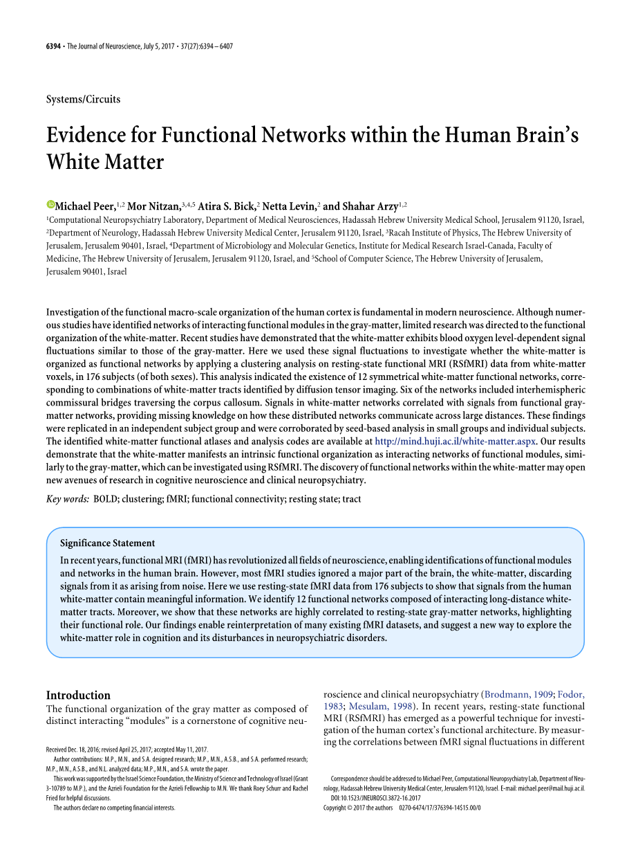 研究人脑皮层的功能宏观组织是现代神经科学的基础。尽管很多研究已经证明了灰质中存在相互连接的功能网络,但是对白质功能组织的研究是有限的。最近的一些研究证明白质表现出与灰质相似的血样水平依赖性信号波动。我们通过对176名受试者(男女都包括)的静息态功能核磁共振成像(RSfMRI)的数据进行聚类分析,研究白质是否被组织成功能网络。分析结果表明,人脑中存在12个对称的白质功能网络,与扩散张量成像识别的结构白质束相对应。其中有六个网络包括穿过胼胝体的半球间连合桥。白质网络中的信号与灰质功能网络中的信号相关,从而为这些分布式网络如何进行远距离通信提供了理论基础。以上结果在一个独立的受试者组中可重复,并得到群组和个体的种子分析验证。已识别的白质功能图谱和分析代码可在http://mind.huji.ac.il/white-matter.aspx查得。我们的研究结果表明,利用RSfMRI技术,白质作为功能模块的交互网络表现出一个内在的功能组织,并且与灰质相似。白质的功能网络的发现可以为认知神经科学和临床神经系统交叉学的研究开辟新途径。