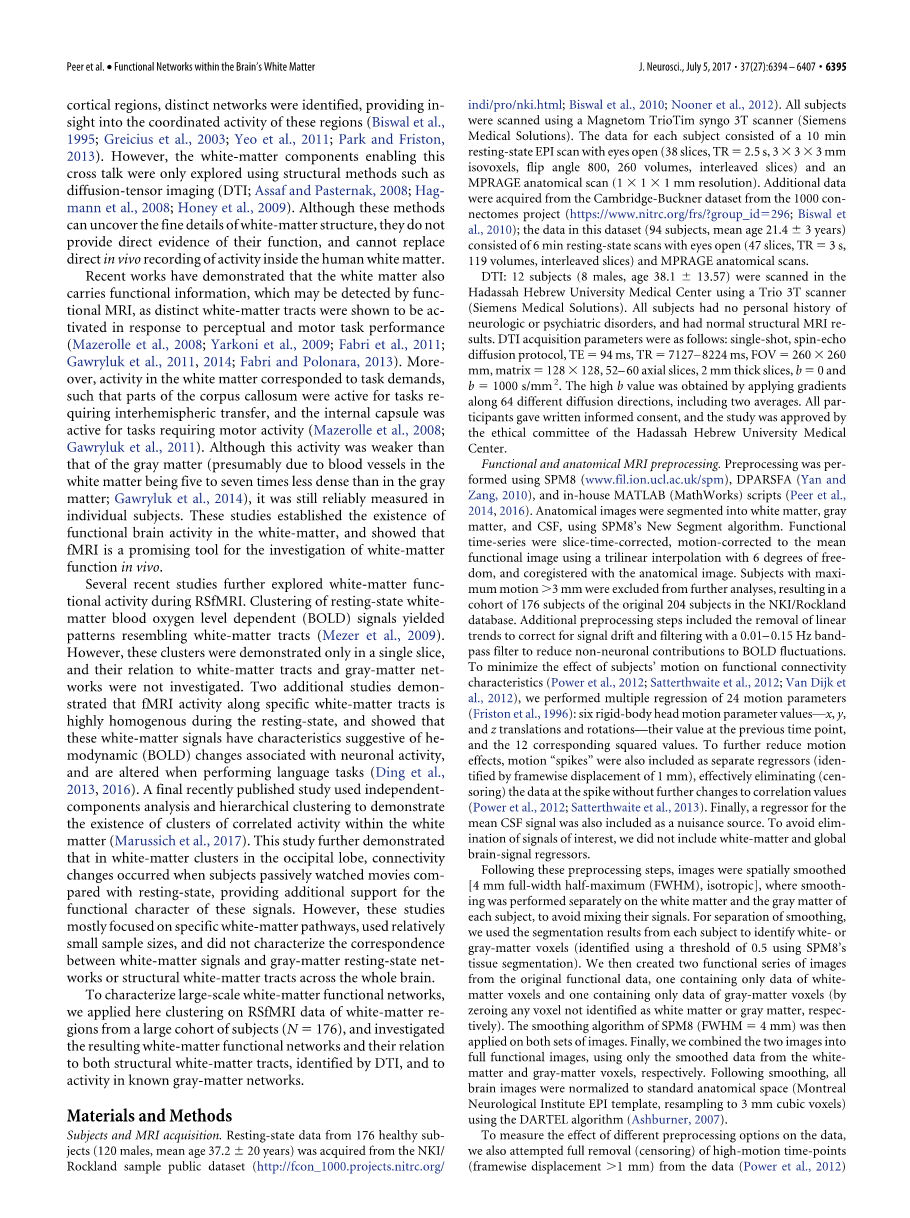 近期的一些研究进一步利用静息态功能核磁共振成像探索了白质功能活动。静息态下的血氧依赖的白质信号的聚类得出了类似于白质纤维束的模式。然而这些聚类分析没有探究白质和灰质之间的关系。另外两项研究表明,在静息状态下,沿特定白质束的功能磁共振成像的信号活性是高度均匀的,并且这些白质信号具有与神经活动相关的血流动力学变化的特征,在执行语言任务时也会发生变化。最近发表的一项研究使用了独立成分分析和层次聚类证明了白质中存在相关活性簇。该研究进一步证明,与静息态相比,当受试者观看电影时,枕叶白质团簇的连通性发生了变化,为这些信号的功能特性提供了证据支持。然而这些研究都主要集中在特定的白质连接的方法上,使用的样本量相对较小,并且没有描述白质信号与大脑的灰质静息状态网络、结构白质束之间的对应关系。