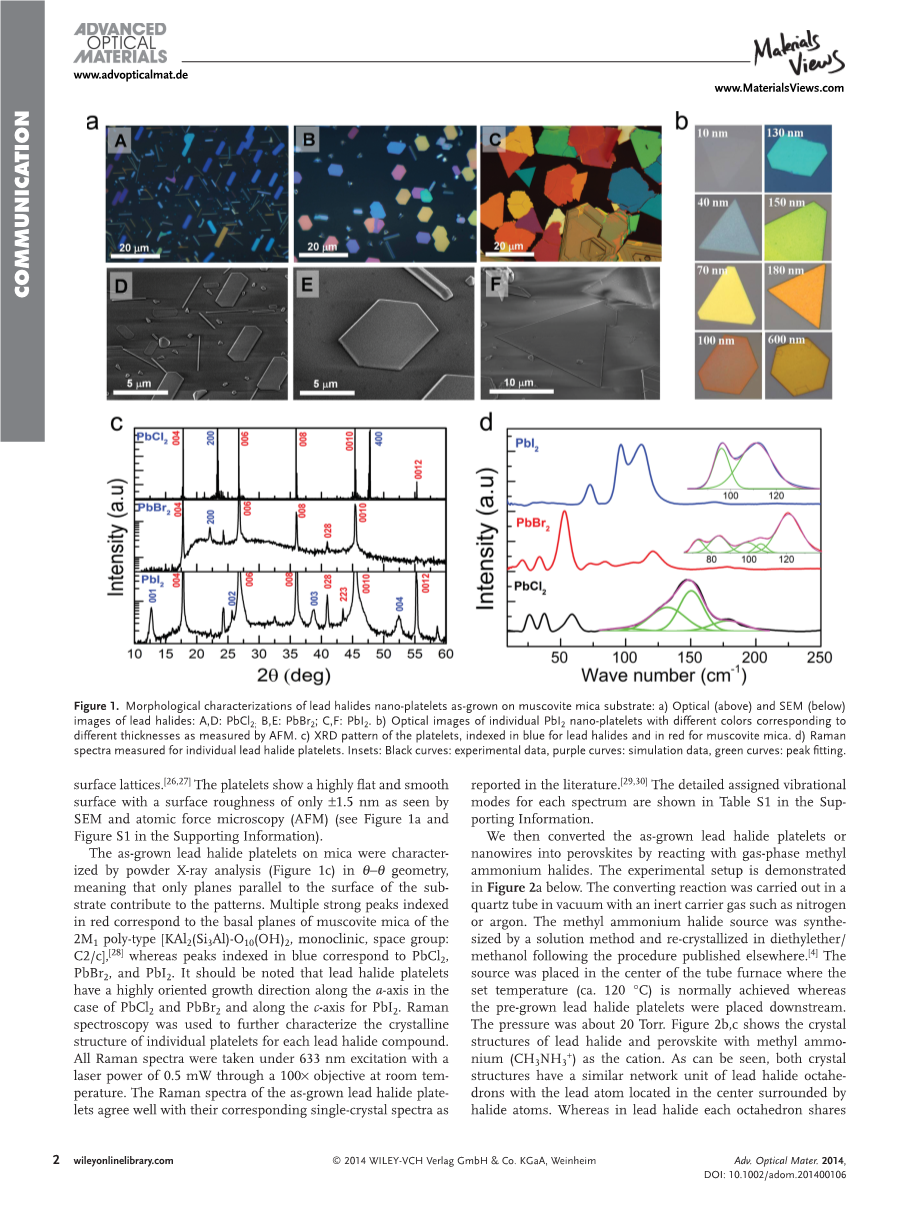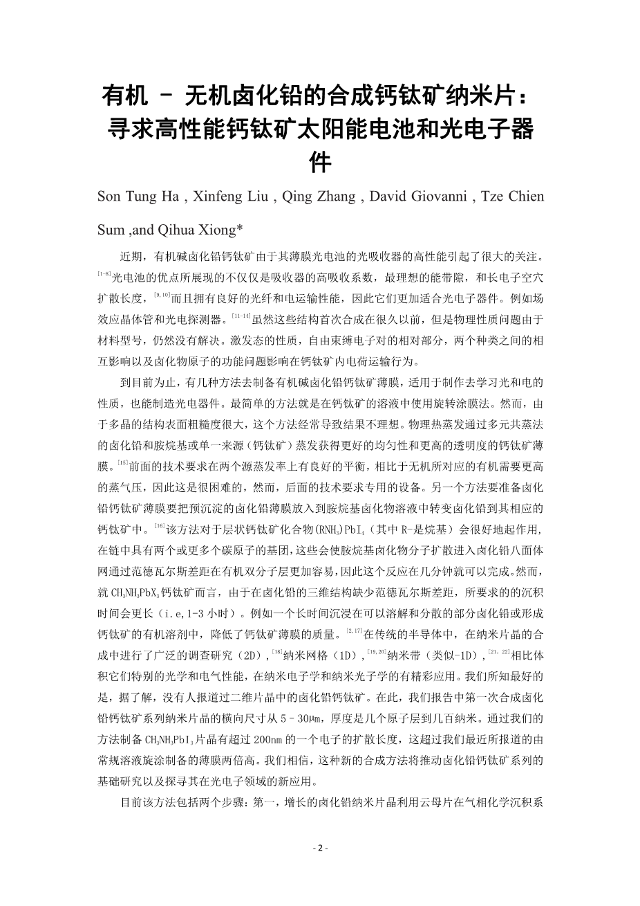 有机-无机卤化铅的合成钙钛矿纳米片:寻求高性能钙钛矿太阳能电池和光电子器件外文翻译资料