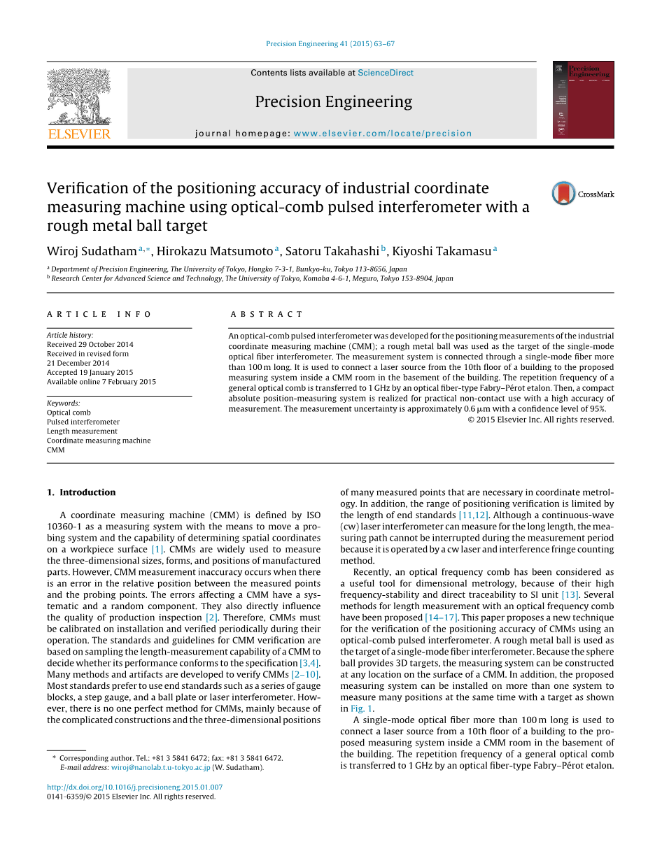 我们开发了一种用于工业坐标测量机(CMM)定位测量的光纤脉冲干涉仪;用粗糙的金属球作为单模光纤干涉仪的目标,测量系统通过长度超过100米的单模光纤连接。它用于将建筑物10层的激光源连接到建筑物地下室CMM室内的建议测量系统。一般光梳的重复频率通过光纤型法布里 - 珀罗标准具转移到1GHz。紧接着我们实现了紧凑的绝对位置测量系统,用于实际的非接触式使用,能够高精度的测量。测量不确定度约为0.6mu;m,置信水平为95%。