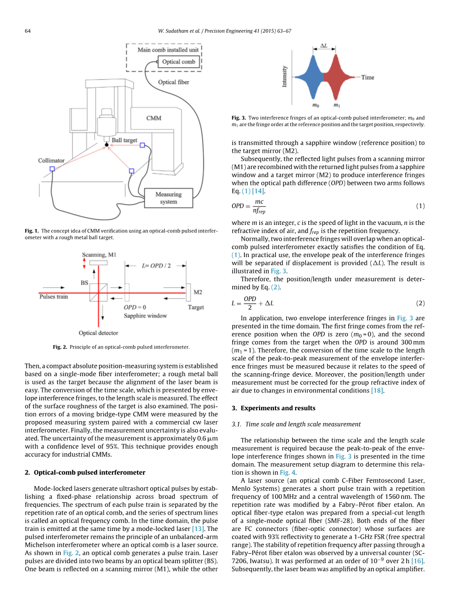 最近,光频梳已被认为是尺寸测量的有用工具,因为它们具有高频率稳定性和对SI单元的直接可追溯性[13]. 已经提出了几种利用光频梳进行长度测量的方法[14–17]. 本文提出了一种利用光梳脉冲干涉仪验证坐标测量机定位精度的新技术。粗金属球用作单模光纤干涉仪的目标。因为球形球提供3D目标,所以测量系统可以构建在CMM表面上的任何位置。此外,所提出的测量系统可以安装在多个系统上,以便与目标同时测量多个位置,如图所示图。1。
