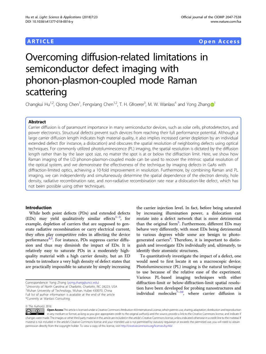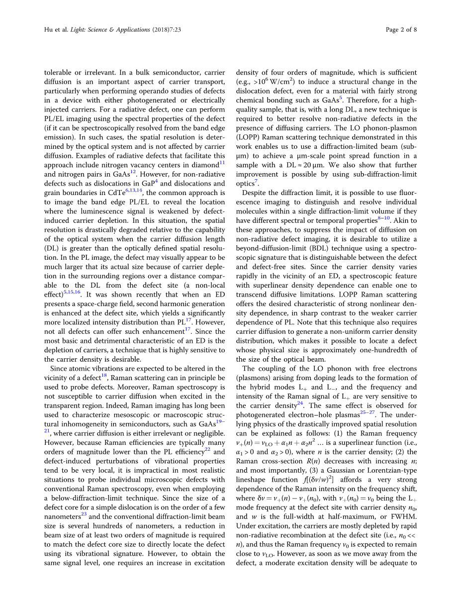 然而,为了获得相同的信号电平,一个信号电平需要增加四个数量级的激发密度,四个数量级的激发密度(例如,)足以引起位错缺陷的结构变化,甚至对于像 GaAs这样的具有相当强的化学键结合的材料也有该效果。因此,对于高质量的样品,也就是说,具有长的载流子扩散长度(DL)的样品,需要一种新技术来更好地解决载流子扩散存在下的非辐射缺陷。在这项工作中证明的等离子体-纵光学声子耦合模(LOPP)拉曼散射技术使我们能够使用衍射受限光束(亚微米)在载流子扩散长度约为20微米的样品中实现微米级点扩展函数。我们还证明了可以通过使用光学子衍射极限做进一步的改进。