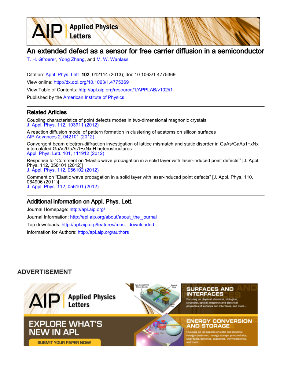 我们使用共焦光致发光显微技术来研究GaAs中孤立的广延缺陷(ED)附近的载流子扩散。我们观察到载流子扩散长度随载流子密度的非单调变化,这归因于点缺陷和广延缺陷之间的竞争。高密度的激光照射会引起广延缺陷结构的永久性变化,更显着的是缺陷有效极性的变化,进而导致其影响范围发生剧烈变化。 推导得出的主要扩散物质的变化给高注入光电器件的设计提出了潜在的考虑因素。@2013美国物理研究所。[http://dx.doi.org/10.1063/1.4775369]