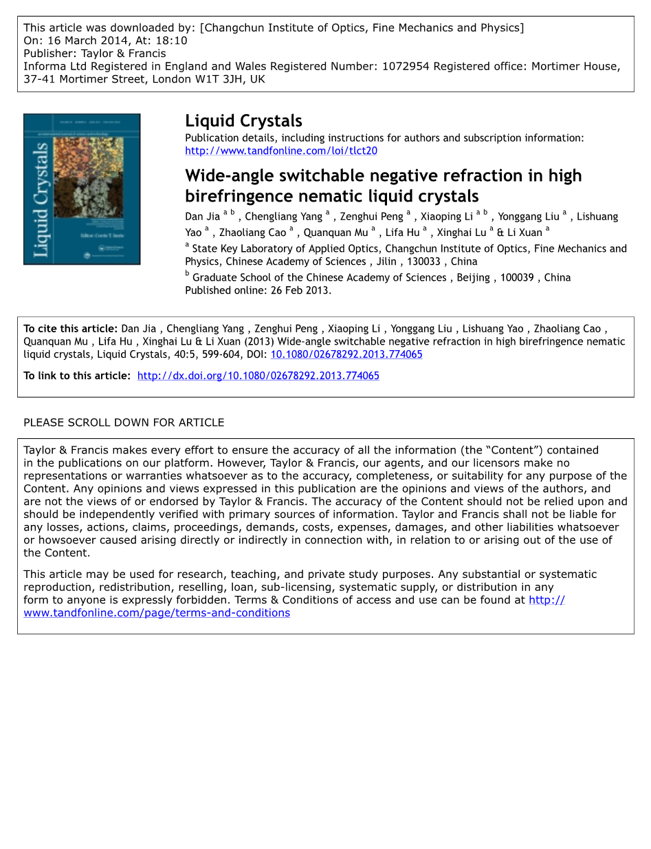 Dan Jiaa,b, Chengliang Yanga, Zenghui Penga, Xiaoping Lia,b, Yonggang Liua, Lishuang Yaoa, Zhaoliang Caoa,Quanquan Mua, Lifa Hua, Xinghai Lua and Li Xuana*