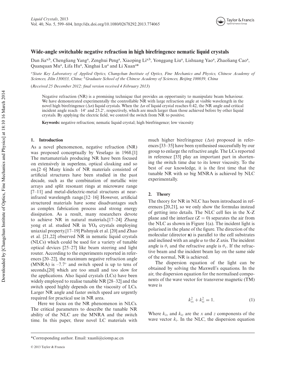 负折射是一种新现象,是由Veselago在1968年首次提出。[1]能够实现负折射的超材料在超透镜、光学隐形等方面受到了广泛的关注。[2-6]近十年来,人们研究了多种由人造结构组成的负折射材料,如金属丝阵列与微波谐振环的组合以及近红外波段的金属-介电-金属结构。[12-16]然而,人造结构材料有一些缺点,如制作方法复杂和大的能量损耗。因此,许多研究人员致力于在天然材料中实现负折射。[17-24]张勇等研究了具有单轴性质的YO4晶体中的负折射,[17-19]Pishnyaketal[20]和Zhaoetal[21,22]观察到向列相液晶(NLCs)中的负折射,可用于多种可调谐光学器件[25-27],如光束导向器和光路由器。根据文献[20-22]中报道的实验,最大负折射角为-7.7°,开关切换速度可达数十秒,[20]对于应用来说负折射角太小切换速度太慢。液晶(LCs)在实现负折射[28-32]可调谐方面有着广泛的应用,其开关速度很大程度上取决于液晶的粘度。在负折射领域中,实际应用迫切需要更大的负折射角和更快的开关速度。