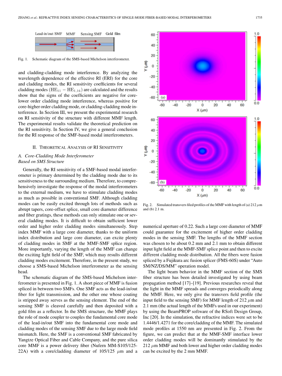 在本文中,我们尝试用单模-多模-单模迈克尔逊干涉仪来解释折射率灵敏度的符号反转现象,并对基于单模光纤的模式干涉仪的折射率传感特性进行了一般描述。单模-多模-单模结构与多模光纤(MMF)作为传感光纤、单模光纤作为传输光纤的单模-多模-单模结构完全不同。在本研究中,传感光纤为单模光纤, 多模光纤作为模耦合器在传感单模光纤中同时激励芯层模式和包层模式。采用这种结构的原因是多模光纤-单模光纤结构比其他包层激励方法更容易激发高阶包层模式。此外,还可以通过改变多模光纤的长度来调整被激发包层模式的阶数。事实上,首次提出多模光纤-单模光纤结构激发包层模式是用于温度传感领域,[11]、[12] 这类结构的折射率响应早已经报道了 [13]-[16]。然而,在参考文献中。只给出了某些包层模式的折射率响应,没有研究包层模式阶数对干涉仪折射率传感性能的影响[13] -[16]。此外,在[13]和[14]中的结构敏感性与[15]和[16]中的相反。因此,在本研究中,我们主要研究包层模式对基于单模光纤的模式干涉仪折射率灵敏度的影响。通过选择两个不同长度的多模光纤,212um和2.1mm,在传感单模光纤中,不同顺序包层模式会被激发,正面和负面折射率敏感性两种都被获得。