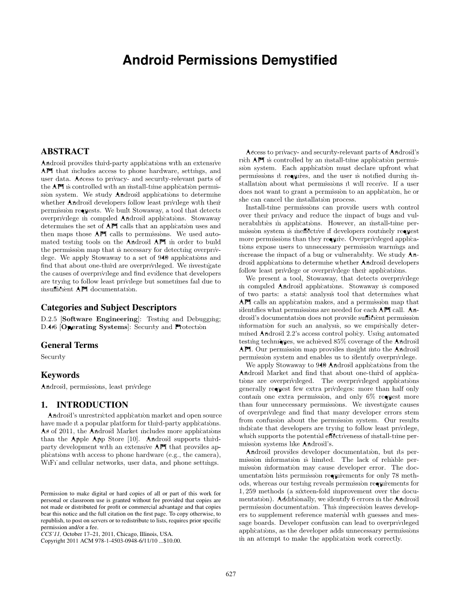 Android系统为第三方应用程序提供了广泛的API,其中包括了一些允许访问手机硬件,系统设置和用户数据的API。而API中隐私和安全相关部分的访问授权是通过一个在安装时对应用程序权限进行授权的系统进行控制的。我们研究了大量Android应用程序以确定Android开发人员是否遵循其权限使用要求中所描述的最低权限准则。我们构建了一个名为Stowaway的工具,它能够在已经编译的Android应用程序中检测程序权限滥用的情况。Stowaway能够确定应用程序所调用的API的集合,然后将这些API调用的集合映射到应用程序权限的集合中。我们在Android API上使用自动化测试工具,以此构建检测权限滥用情况所必需的映射关系。我们将Stowaway应用于940个应用程序中,并且发现大约三分之一的应用程序有滥用权限的情况。我们调查权限滥用的原因,并找到了一些能够证明开发人员尝试遵循最低权限,但有时会因为API文档不足而失败的证据。