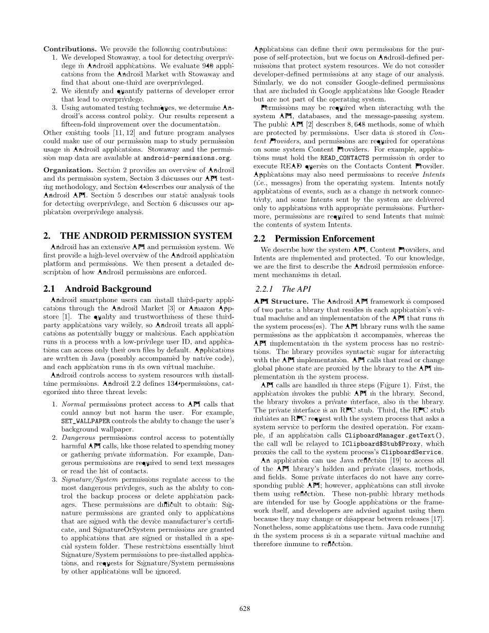 组织结构:第2节提供了一个关于Android及其权限系统的概述,第3节讨论了我们的API测试方法,第4节描述了我们对Android API的分析。第5节描述了我们用于检测特权的静态分析工具,第6节讨论了我们的应用程序特权分析。