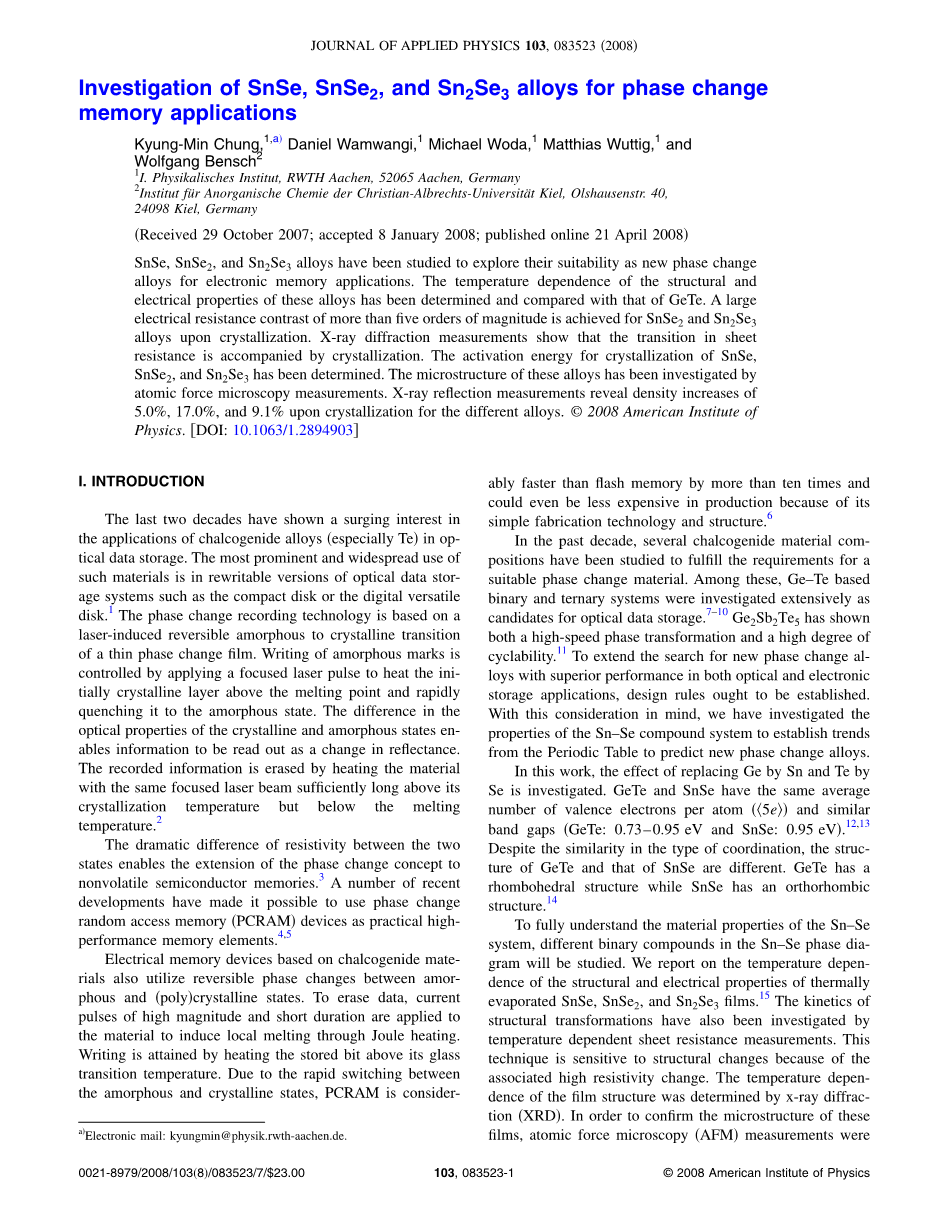 SnSe, SnSe2, Sn2Se3合金已经被研究以探索它们作为电子存储应用新型相变合金的稳定性。结构对温度的依赖性以及这些合金的电学性质已经被确定并且和GeTe的性质做了比较。实现了SnSe2和 Sn2Se3合金在结晶化中超过五个数量级的电阻差异。X射线衍射测量表明通过结晶化实现了表明电阻的转变。SnSe, SnSe2, Sn2Se3的结晶化中的活化能已经被确定下来了。通过原子力显微镜已经调查研究了这些合金的微结构。X射线反射测量显示出,通过结晶化这些不同合金分别有了5.0%,17.0%,和9.1%的密度增长。