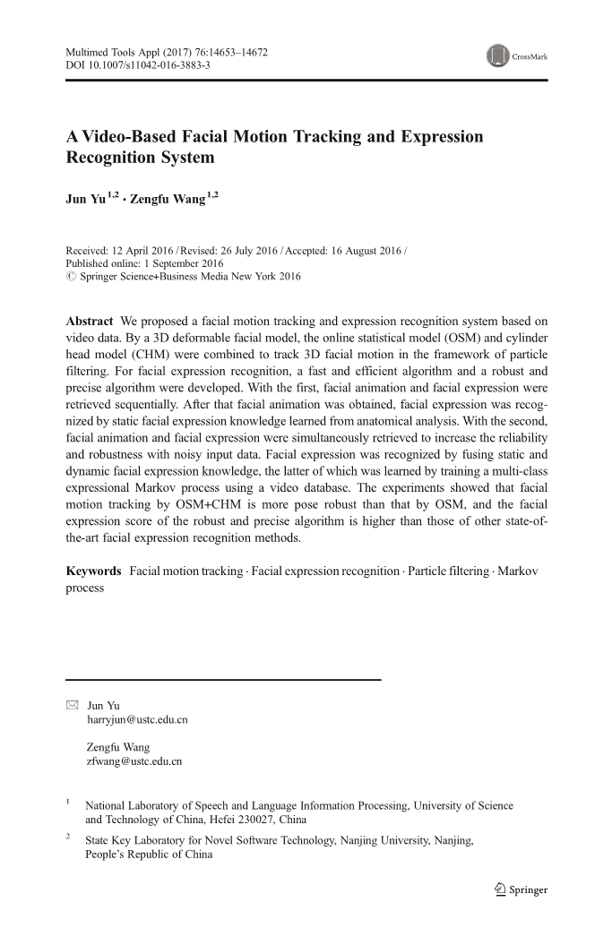 摘要:我们提出了一个基于视频数据的面部运动跟踪和表情识别系统。通过一个可变形的3D面部模型,在线统计模型(OSM)和圆柱头部模型(CHM)可以结合起来在粒子过滤框架中用于跟踪3D面部运动。对于面部表情识别,一个快速和高效的算法和一个健壮精确的算法已经有所发展。首先,面部动画和面部表情是依次处理。在获得面部动画之后,面部表情通过静态面部表情知识被识别,这些知识是从视频分析中获得。然后面部动画和面部表情被同时检索以增加可靠性和噪声输入数据的鲁棒性。面部表情通过融合静态和动态面部表情知识来识别,后者是通过训练多级表情马尔可夫处理过程来获得,其中用到一个视频数据库。实验表明,基于OSM CHM进行的面部运动跟踪比OSM的更强健,并且其面部表情的鲁棒性和精确性算法的评分高于其它最先进的面部表情识别方法。