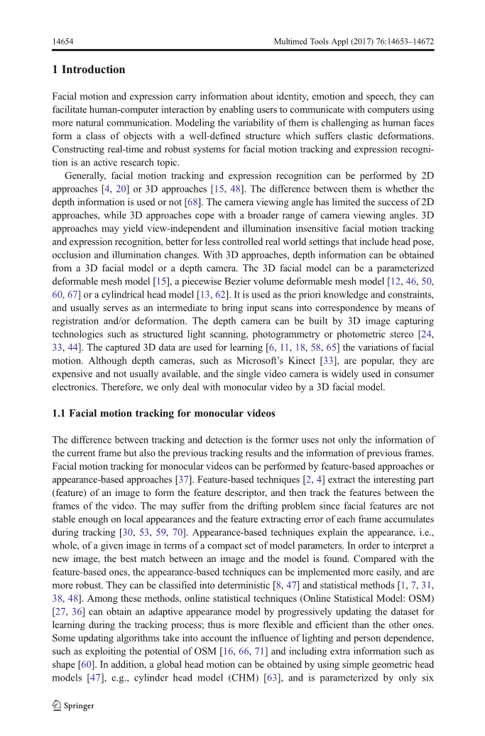 通常,面部运动跟踪和表情识别可以通过2D方法[4,20]或3D方法[15,48] 来执行。它们之间的区别在于是否使用深度信息[68]。相机视角限制了2D方法,而3D方法可以应对更广泛的相机视角。3D方法可以构建独立视点并且光照不敏感的面部运动跟踪和表情识别系统,更好的处理现实世界中的问题,比如头部姿势变化,遮挡和照明变化等。通过3D方法,使用3D面部模型和深度相机可以获得深度信息。3D面部模型可以是参数化的可变形网格模型[15],分段Bezier体积可变形网格模型[12,46,50,60,67]或圆柱头模型[13,62]。它被用作先验知识和约束条件,并且通常作为一个媒介来通过注册或变形的方式将输入扫描转化成一致的。深度相机可以通过诸如结构光扫描,摄影测量或光度立体[24,33,44]的3D图像捕捉技术来实现。捕获的3D数据用于学习[6,11,18,58,65]面部运动的变化。虽然深度相机,如微软的Kinect [33],很受欢迎,但它们是昂贵且通常不可购买,并且单摄像机广泛应用于消费者的电子产品。因此,我们只通过3D面部模型来处理单眼视频。
