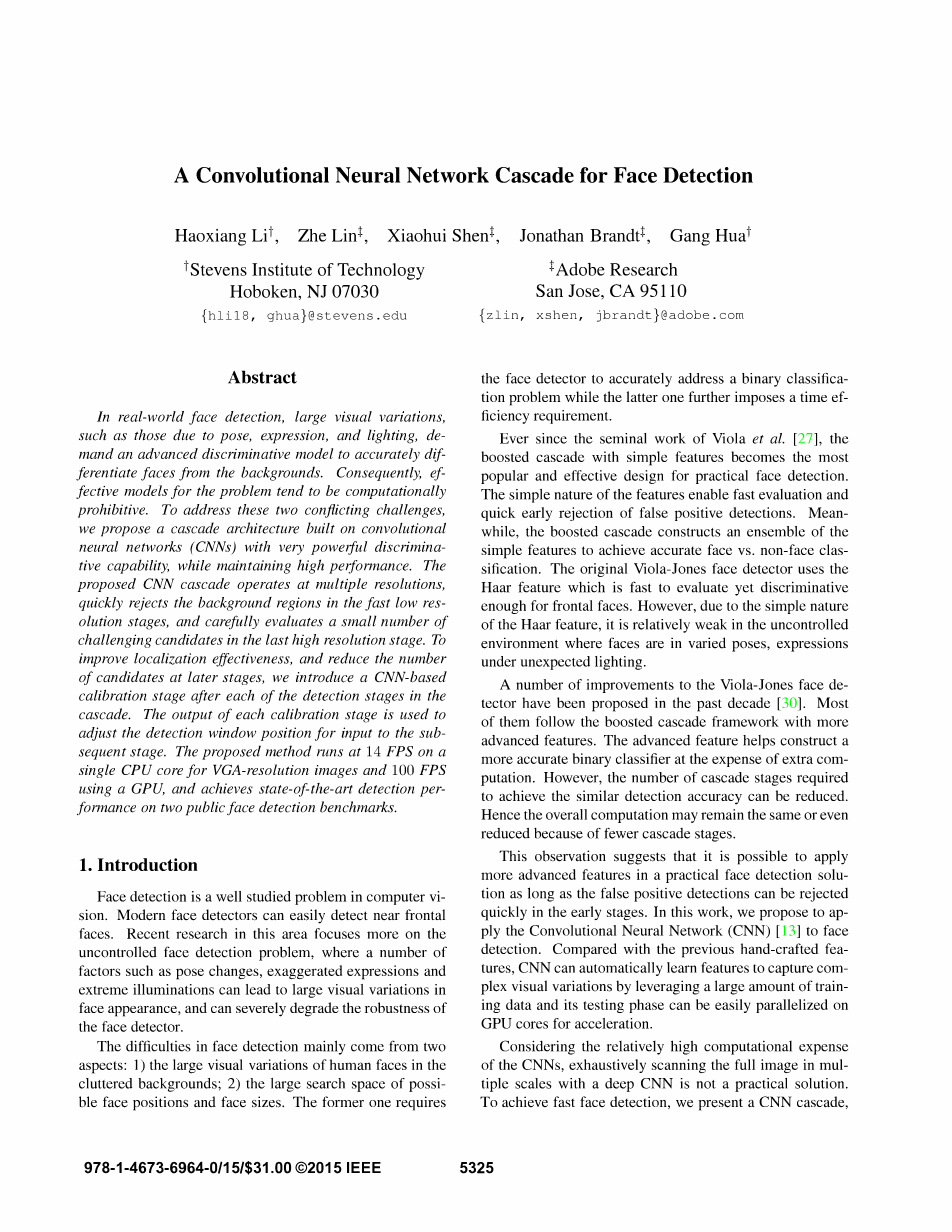在现实世界的人脸检测中,较大的视觉变化,比如由于姿势、表情和光线的变化,需要一种高级的辨别模型来准确区分人脸和背景。因此,问题的有效模型往往难以计算。为了解决这两个相互冲突的挑战,我们提出了一种基于卷积神经网络(CNNs)的级联结构,具有很强的识别能力,同时保持高性能。建议的CNN级联在多个分辨率下运行,快速地拒绝快速低分辨率阶段的背景区域,并在最后一个高分辨率阶段仔细评估少量具有挑战性的候选者。为了提高定位效果,并在后续阶段减少候选的数量,我们在级联的每个检测阶段之后引入一个基于CNN的校准阶段。每个校正阶段的输出用于调整检测窗口的位置,以便输入到后续的阶段。该方法在一个CPU核心上运行14个FPS,用于VCA-resolution图像,100个FPS使用一个GPU,并在两个公开的人脸检测基准上实现最先进的检测性能。