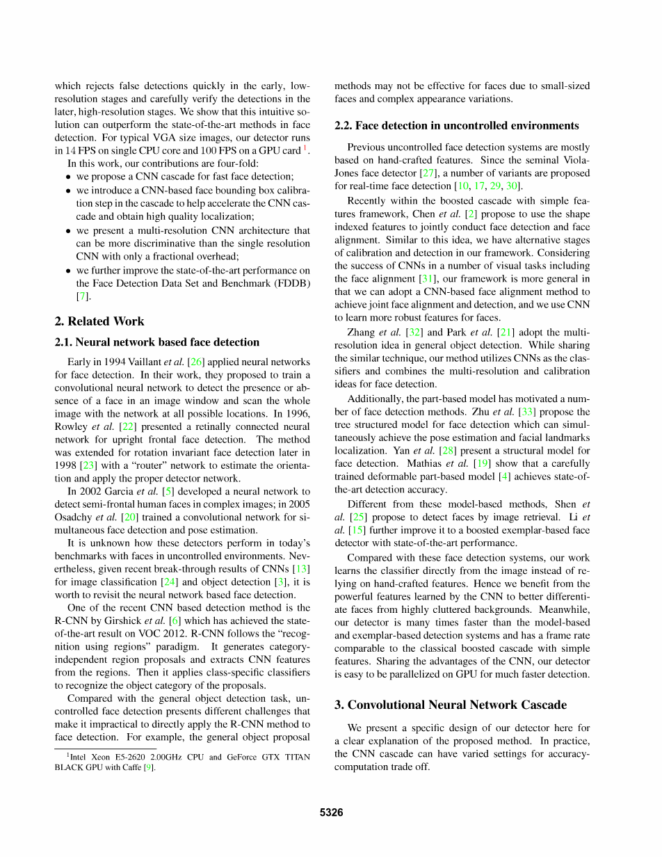 考虑到CNNs相对较高的计算费用,用一个深的CNN对多尺度下的完整图像进行详尽的扫描并不是一个实际的解决方案。为了实现快速的人脸检测,我们提出了一个CNN级联,它在早期的低分辨率阶段快速地拒绝了错误的检测,并在随后的高分辨率阶段仔细验证了检测结果。我们证明,这种直观的解决方案在人脸检测中可以胜过最先进的方法。对于典型的VGA大小图像,我们的检测器在单个CPU核心上运行14个FPS,在GPU上运行100个FPS。