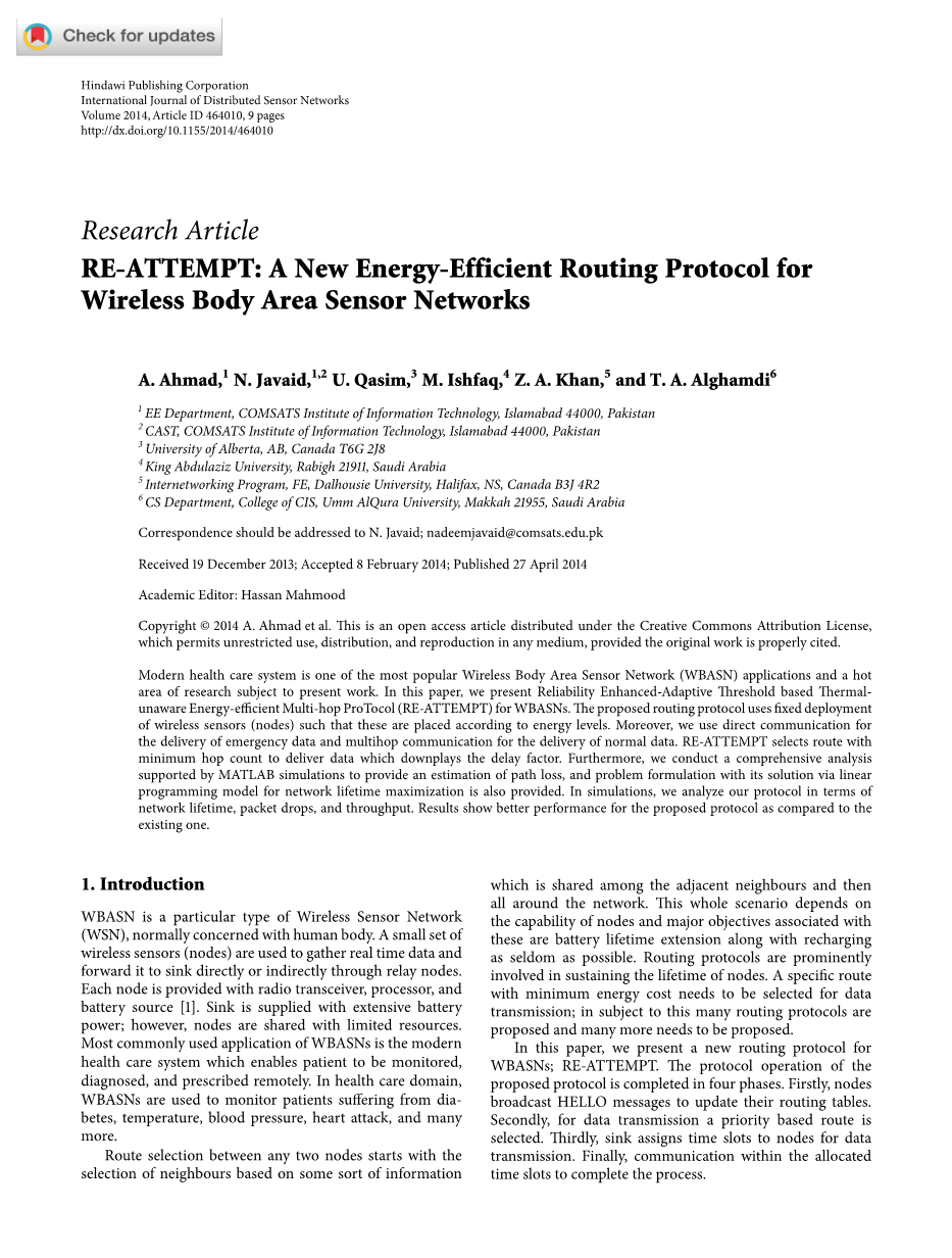 在本文中,我们提出一个新的无线体域网路由协议,RE-ATTEMPT。这个协议的操作分四个阶段完成。首先,节点广播“你好”消息更新自己的路由表。其次,为数据传输设定路由优先权。第三,汇聚节点为节点的数据传输分配时间间隔。最后,在分配好的时间间隔内完成通信。
