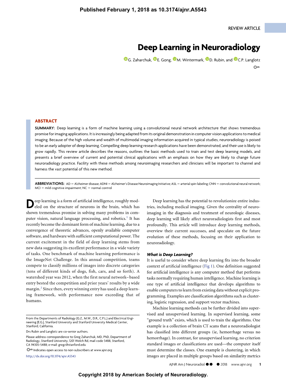 深度学习有潜力彻底改变整个行业,包括医学成像。鉴于神经影像学在诊断和治疗神经系统疾病中的重要性,深度学习可能会首先影响神经放射学家
