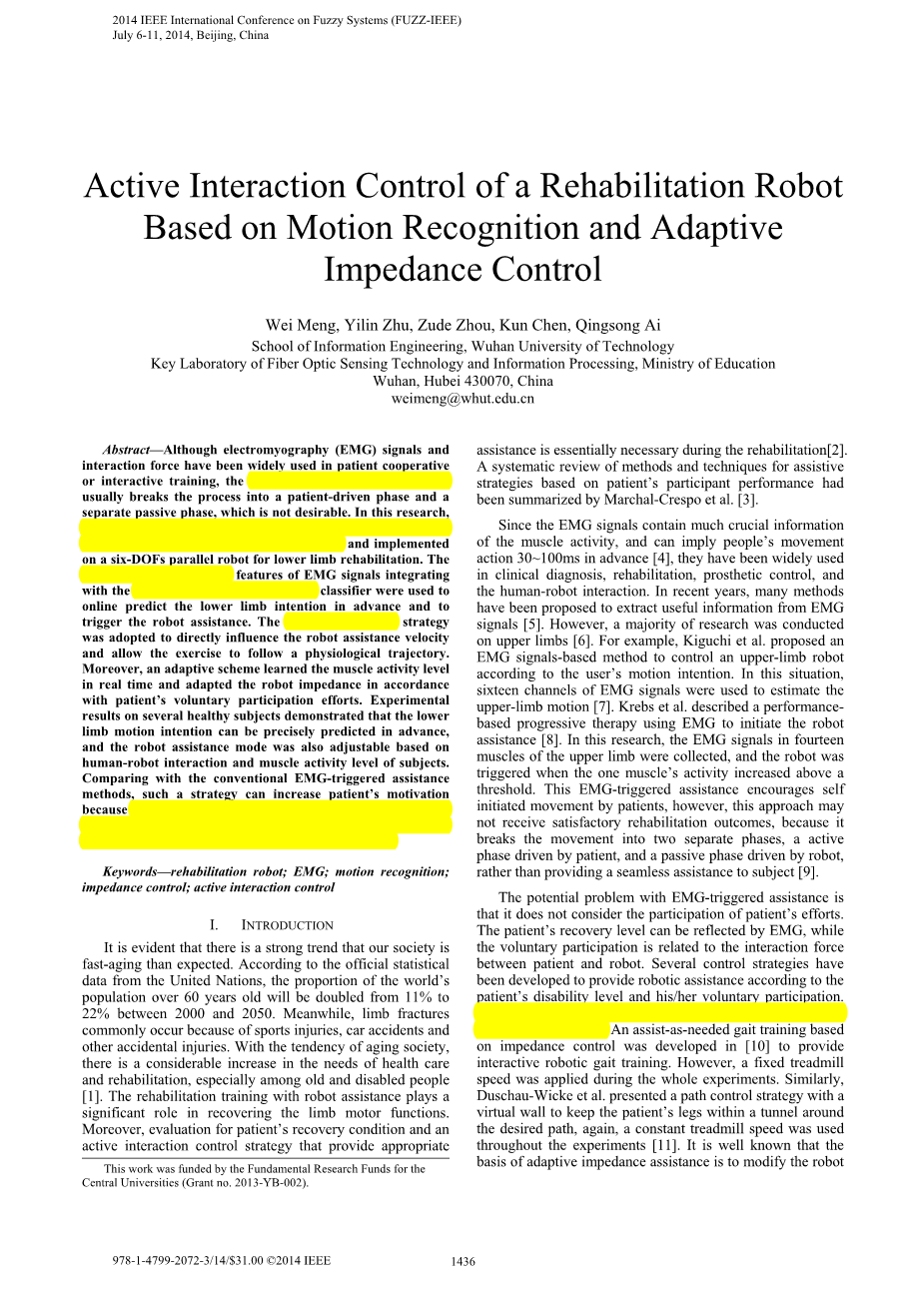 在本文中,我们提出了一种用于人体下肢运动辅助的多自由度并联机器人,其中将EMG信号和主动相互作用力与自适应阻抗控制器集成在一起,以实现机器人用户的有效运动辅助。本研究中的主动交互控制过程包含四个步骤,如图4所示:(1)EMG信号采集和预处理,包括过滤和放大; (2)通过EMG和SVM分类器RMS特征的融合进行肢体意图预测和运动解码; (3)实时更新阻抗参数和关节速度命令。提出了一种控制规律,将肌肉活动率与阻尼参数相关联,以便根据人体相互作用力调整训练速度; (4)遵循预定义的基于逆运动学和模糊自适应控制器的平滑轨迹。平行康复机器人具有六个自由度,并且基于模糊控制器的轨迹跟踪方法被实现为位置/速度控制器以引导对象的肢体参考轨迹[1]。由于人体控制的参与必然会促进患者在运动过程中的活动,因此这种策略可以增加患者的动机,因为肌肉活动会发生变化,并且相互作用的努力将直接反映在训练速度上,并产生一致的成功感。