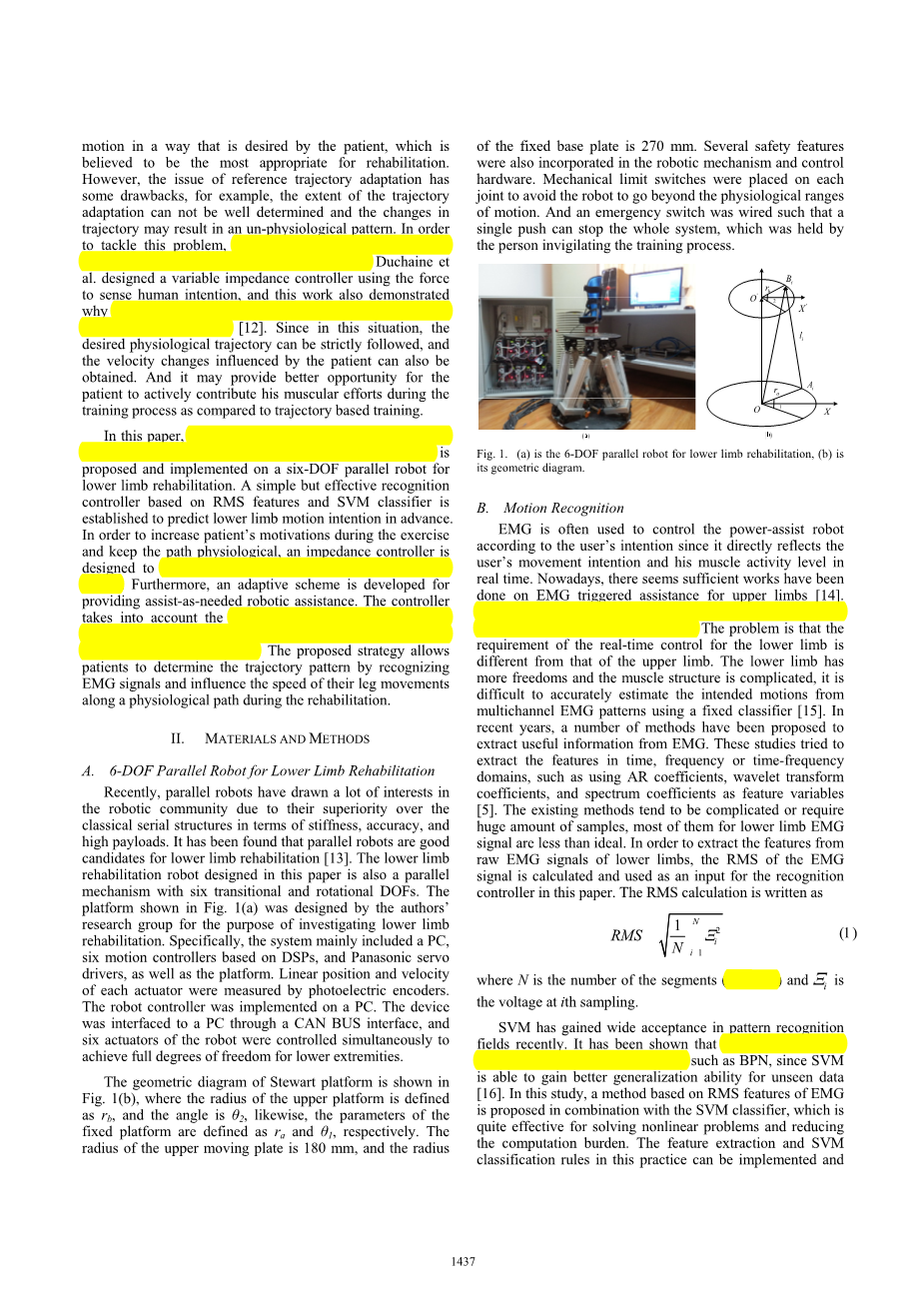 使用阻抗控制代替位置控制,病人的额外努力可以反映在机器人辅助模式中,这可能会增加他/她的动机。但是,修改参考轨迹可能会增加受检者和机器人开始移出生理阶段的风险。因此,本文中的机器人协助根据患者的努力来调整其速度,同时保持轨迹固定。此外,由于肌肉活动比率的不同水平,阻抗水平可能变化很大,以匹配患者的能力和恢复进展。在提出的策略中,首先使用EMG信号识别患者的运动意图。 RMS方法从原始EMG信号中提取特征简单且有效,并且结果也证明了SVM分类器的有效性。建议从选定肌肉记录的EMG信号可用于触发机器人辅助。然后,根据患者的互动努力,采用阻抗控制器使机器人符合标准;同时,基于肌肉活动的自适应方法被用来调整阻抗参数,并影响机器人对个人贡献的帮助。