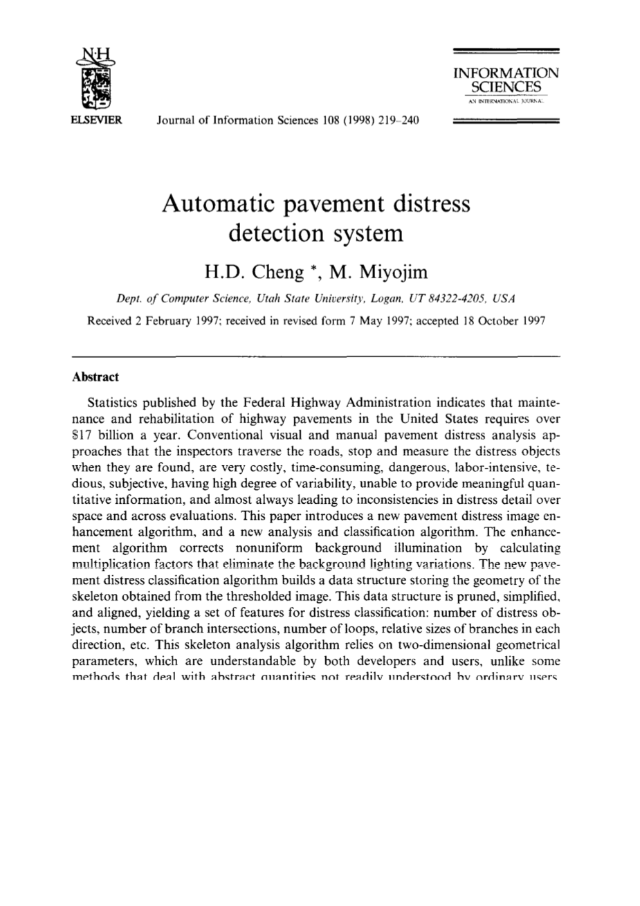 联邦公路管理局公布的统计数据表明,美国公路路面的养护和修复每年需要170亿美元。传统的视觉和手动路面破损分析方法是当发现破损对象时,检查人员穿越道路,停止和测量它们。这种方法是非常昂贵的、耗时的、危险的、劳动密集的、单调乏味的、主观的、具有高度可变性的,不能提供有意义的定量信息,并且几乎总是导致破损细节在空间和跨评估上的不一致。本文介绍了一种新的路面破损图像增强算法,并提出了一种新的分析和分类算法。增强算法通过计算消除背景光照变化的倍增因子来修正非均匀背景光照。新的路面破损分类算法建立了一个数据结构,存储了从阈值图像获得的骨架。这个数据结构被修剪,简化,对齐,产生一组破损分类的特征:破损对象的数量、分支交叉点的数量、循环的数量、分支的相对大小。这种骨架分析算法依赖于二维几何参数,这是开发者和用户都可以理解的,不像某些处理普通用户不易理解的抽象量的方法。所提出的分析算法能够精确地量化几何和拓扑参数,可以快速接受新的分类规则来进行分类,并可以从阈值图像估计破损严重性。实验结果令人满意。copy;1998由爱思唯尔科学公司出版保留所有权利。