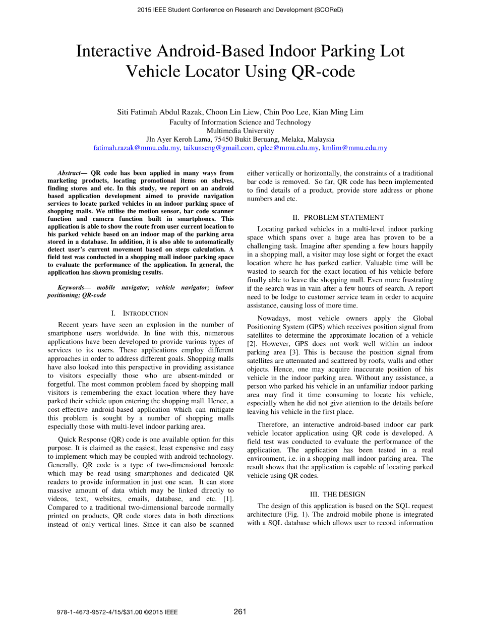 因此,我们开发了一个基于安卓的交互式室内停车场车辆定位器应用程序,并且实地对该应用程序的性能进行了测试。我们选择在一个购物中心的室内停车场进行测试,测试结果表明,该应用程序能够使用二维码定位停放车辆,利用该系统可以快速准确的找到停车位,节约时间,提高效率,可以为用户提供极佳的车场体验,同时可以优化管理和降低成本,为城市安全及交通管理服务,为出行者服务,有效地提高交通管理的流畅性和可靠性。