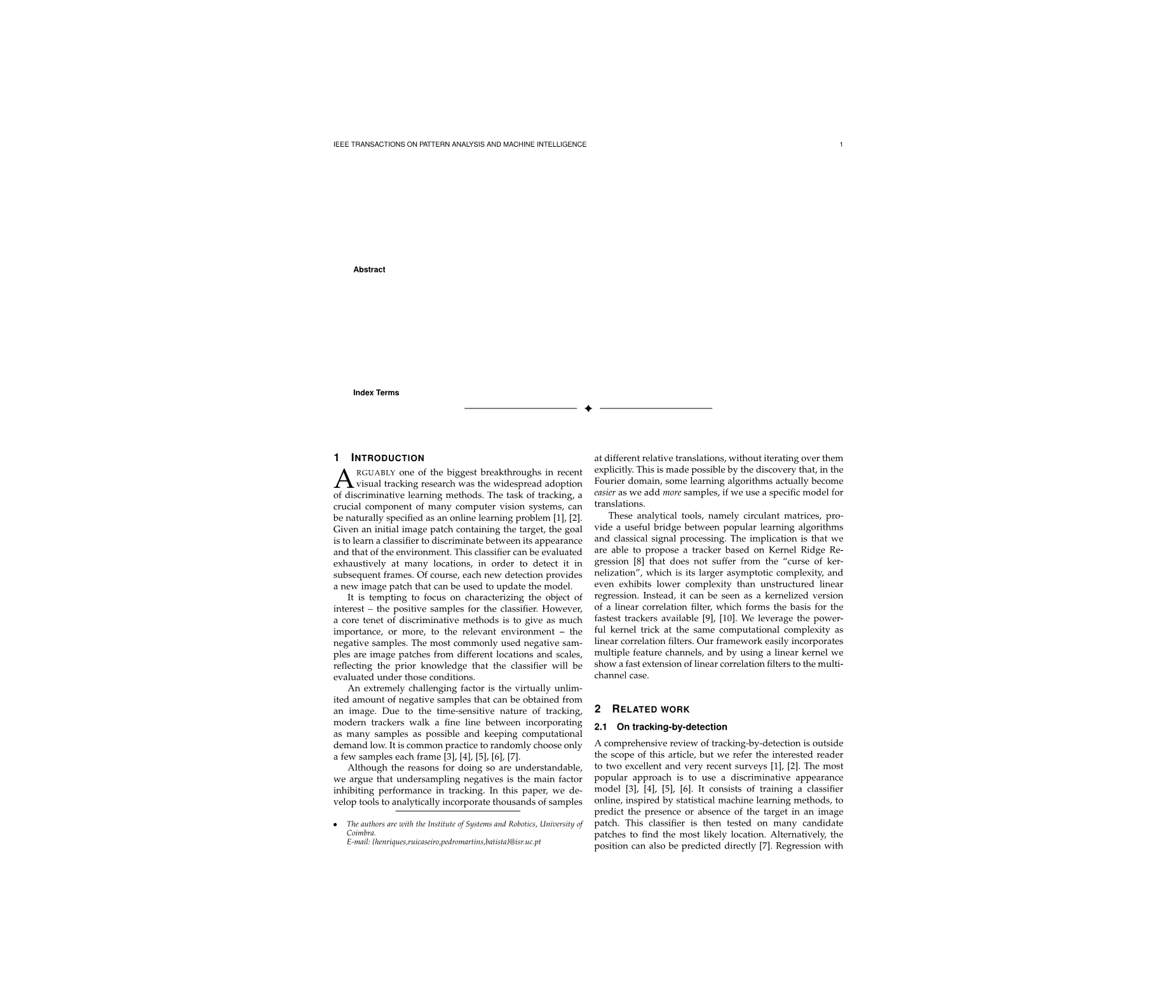 在最近的视觉跟踪研究中,最重要的突破之一就是广泛采用了辨别性学习方法。跟踪是许多计算机视觉系统的重要组成部分,它可以被自然地指定为在线学习问题[1], [2]。给定一个包含目标的初始图像补丁,目标是学习一个分类器来区分它的外观和环境。这种分类器可以在许多位置进行详尽的评估,以便在后续的帧中进行检测。当然,每个新发现都提供了一个新的图像补丁,可以用来更新模型。人们很容易将注意力集中在对感兴趣的对象的描述上——分类器的正样本。然而,区分方法的一个核心原则是给予相关的环境——即负样本——同等重要或更多。最常用的负样本是来自不同位置和尺度的图像补片,反映了在这些条件下分类器将被评估的先验知识。一个极具挑战性的因素是,几乎无限数量的负样本可以从图像中得到。由于跟踪的时间敏感性,现代追踪器在尽可能多的样本和保持计算的需求之间走一条细线。一般的做法是随机选取几个样本,每一帧[3], [4], [5], [6], [7]。虽然这样做的原因是可以理解的,但我们认为,在跟踪中,负采样的负性是抑制性能的主要因素。在本文中,我们开发了一种工具,可以在不同的相对翻译中对数千个样本进行分析,而不需要对它们进行显式的迭代。这是有可能的发现,在傅里叶域中,一些学习算法实际上变得更容易,因为我们添加了更多的样本,如果我们使用一个特定的模型来翻译。这些分析工具,即循环矩阵,在流行学习算法和经典信号处理之间提供了有用的桥梁。这意味着我们可以提出一个基于Kernel Ridge Regression[8]的跟踪器,它不会受到“kerne”的影响,这是它更大的渐近复杂性,甚至比非结构化线性回归的复杂性更低。相反,它可以被看作是线性相关滤波器的一个kerne版本,它构成了最快的追踪器的基础[9], [10]。我们利用强大的内核技巧与线性相关过滤器相同的计算复杂度。我们的框架很容易合并多个特性通道,通过使用一个线性内核,我们可以快速地将线性相关滤波器扩展到多通道情况。