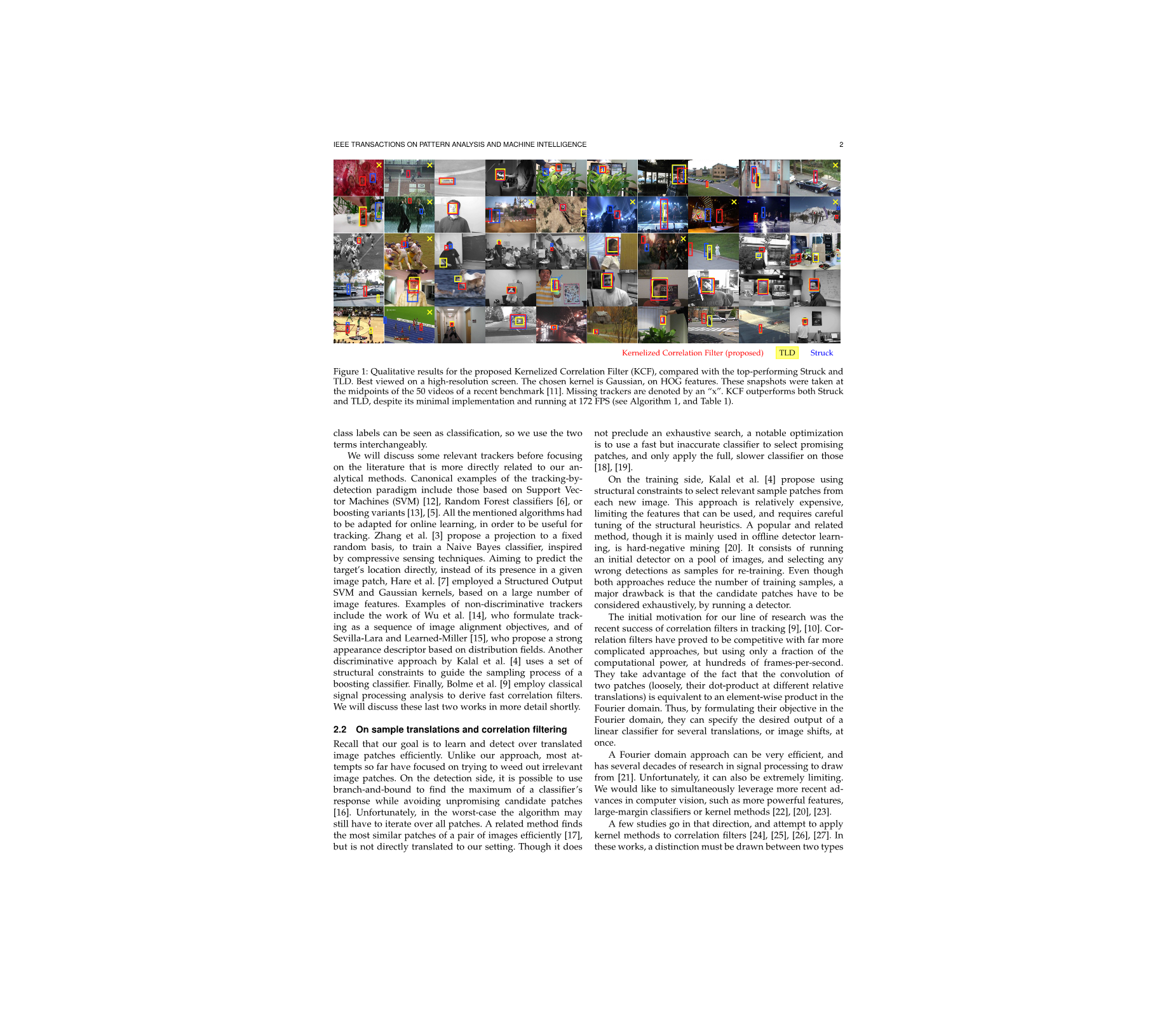 回想一下,我们的目标是有效地学习和检测翻译过的图像补丁。与我们的方法不同的是,到目前为止,大多数尝试都集中在清除无关的图像补丁上。在检测方面,可以使用分支-绑定来查找分类器响应的最大程度[16]。不幸的是,在最坏的情况下,算法仍然需要遍历所有补丁。一种相关的方法可以有效地找到一对图像中最相似的部分[17],但是没有直接翻译到我们的设置中。虽然它并不排除彻底的搜索,但值得注意的优化是使用快速但不准确的分类器来选择有希望的补丁,并且只在那些[18], [19]上应用完整的、较慢的分类器。在培训方面,Kalal等[4]提出利用结构约束从每个新图像中选择相关的样本补丁。这种方法比较昂贵,限制了可以使用的特性,并且需要对结构启发式进行仔细的调优。一种流行的、相关的方法,虽然主要用于脱机检测器学习,但它是一种硬负极挖掘[20]。它包括在图像池中运行初始检测器,并选择任何错误的检测作为样本进行再培训。尽管这两种方法都减少了训练样本的数量,但一个主要的缺点是,必须通过运行一个检测器来彻底地考虑候选补丁。我们研究的最初动机是最近跟踪[9], [10]的相关滤波器的成功。相关滤波器已经被证明具有更复杂的方法,但是仅仅使用了计算能力的一小部分,在数百帧每秒。它们利用了两个补丁的卷积(松散地,它们的点积在不同的相对翻译上)相当于在傅里叶域中的一个元素的乘积。因此,通过在傅里叶域内制定目标,他们可以同时指定一个线性分类器的期望输出。一个傅立叶域方法可以非常有效,并且有几十年的研究信号处理从[21]。不幸的是,它也可能是极其有限的。我们希望同时利用计算机视觉的最新进展,例如更强大的特性、大范围的分类器或内核方法[22], [20], [23]。一些研究朝这个方向发展,并尝试将内核方法应用于相关过滤器[24], [25], [26], [27]。之间必须画在这些作品中,区分两种类型的目标函数:那些不考虑功率谱或图像翻译,如综合判别函数(SDF)过滤器[25],[26],和那些做什么,比如最小平均相关能量[28],[27]和最小输出最佳权衡平方误差的总和(MOSSE)过滤器[9]。由于空间结构可以有效地忽略,因此前者更容易实现,而内核SDF滤波器已被提出[26], [27], [25]。然而,在翻译的图像、非线性内核和傅里叶域之间缺乏清晰的关系,将内核技巧应用到其他过滤器中已经被证明是非常困难的[25],[24],有些建议需要大大提高计算时间,并对可考虑的图像转换的数量施加严格的限制[24]。对于我们来说,这暗示了需要在翻译的图像补丁和训练算法之间建立更深的联系,以克服直接傅立叶域公式的局限性。
