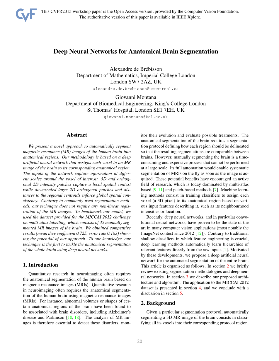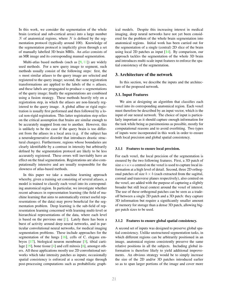 在本文中,我们采用一种机器学习方法,其中,给定由多个地图集组成的训练集,训练模型以将每个体素分类到其对应的解剖区域。在本文中,我们采用一种机器学习方法,其中,给定由多个地图集组成的训练集,训练模型以将每个体素分类到其对应的解剖区域。特别是,我们调查表示学习(机器学习领域旨在自动提取数据的有用表示)的最新进展是否对分割问题有益。深度学习是表示学习的子领域,涉及学习数据的多级或分层表示,每个级别都基于前一个[1]。最近深度学习应用在很多医学图像分割问题的项目中,特别是卷积神经网络。其中包括了分割肺的方法[16],线虫胚胎[17],生物神经元膜[5],胫骨软骨细胞[19],骨组织[4]和细胞有丝分裂[6]等等。所有这些应用大多使用以卷积强度作为输入的二维卷积网络;偶尔空间一致性在第二阶段通过后处理计算,例如概率图形模型。尽管人们对医学成像的兴趣日益增加,但深层神经网络还没有考虑到整个大脑分割成解剖区域的问题。初始的工作是使用局部2D补丁作为输入来分割大脑的单个(中央)2D切片[14]。相比之下,我们的方法解决了整个3D大脑的分割问题并引入多尺度输入特征来强化分割的空间一致性。