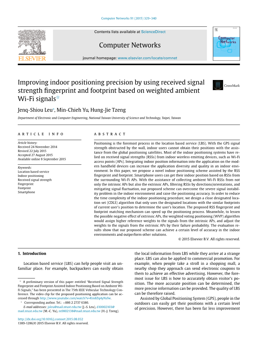 定位是基于位置的服务(LBS)中最重要的过程。由于GPS信号强度被墙堵塞,室内用户无法在全球定位卫星的帮助下获得其位置。大多数室内定位系统都依赖于室内无线发射设备(如Wi-Fi接入点(AP))的接收信号强度(RSS)。将室内位置信息集成到现代手持设备的应用中可以增加室内环境中的应用多样性和质量。在本文中,我们提出了一种新的RSS指纹和足迹辅助的室内定位方案。智能手机用户可以根据来自周围Wi-Fi接入点的RSS获取他们的室内位置。通过不仅从固有接入点,而且从外部接入点收集环境Wi-Fi RSS,通过方向/方向对RSS进行滤波以及减轻信号波动,我们提出的方案可以克服室内环境中严重的信号不稳定问题并提高定位精度。为了减少室内定位过程的时间复杂度,我们设计了一个关闭指定位置集(CDLS)算法,该算法仅使用具有当前用户位置的相似足迹的指定位置来确定用户的位置。所提出的RSS指纹和足迹匹配机制可以加速定位过程。同时,为了减少外部AP的可能的负面影响,加权投票定位(WVP)算法将为来自固有AP的信号分配更高的参考权重,并根据其失败概率调整来自外部AP的信号的权重。评估结果表明,我们提出的方案可以在室内环境中达到一定的准确度,并且胜过其他解决方案。