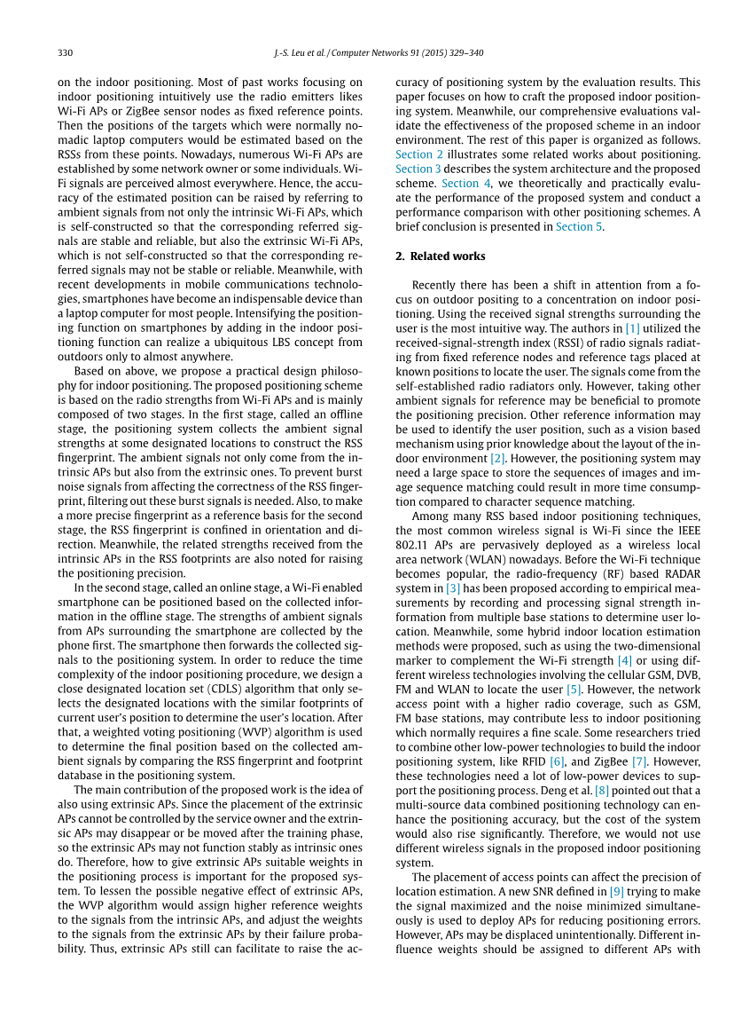 提议工作阶段的主要贡献是使用外部AP的想法。由于外部接入点的放置不能由业务所有者控制,外部接入点可能在训练阶段后消失或移动,因此外部接入点可能无法像内部接入点一样稳定运行。因此,如何在定位过程中为外部AP提供合适的权重对于所提出的系统是重要的。为了减少外部AP的可能的负面影响,WVP算法将为来自固有AP的信号分配更高的参考权重,并通过其失败概率调整来自外部AP的信号的权重。因此,外在接入点仍然可以通过评估结果方便地提高定位系统的准确性。本文重点介绍如何制定建议的室内定位系统。同时,我们的综合评估验证了该方案在室内环境中的有效性。本文的其余部分安排如下。第2节说明了一些有关定位的相关工作。第3节描述了系统架构和提议的方案。第4节,我们从理论上和实践上评估了所提议系统的性能,并与其他定位方案进行了性能比较。第5节给出了一个简短的结论。