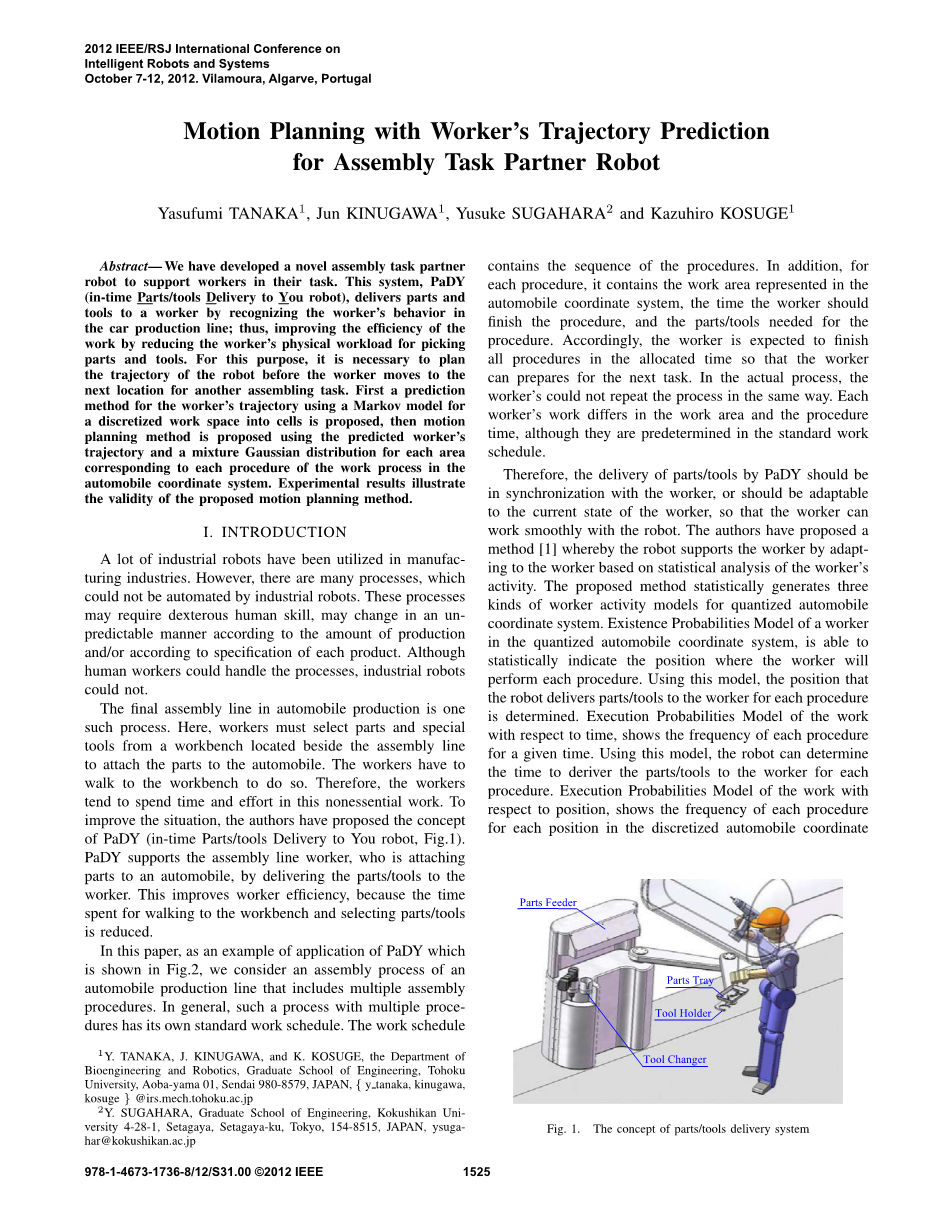 我们开发了一种新型的装配任务伙伴机器人,以支持工人完成任务。这个系统,PADY(实时P艺术/工具Delivery to You机器人),将零件和工具交付给工作人员。机器人通过识别工人在汽车生产线上的行为,从而通过减少工人挑选零件和工具的体力劳动来提高工作效率。为此目的,在工人移动到另一个装配任务的下一个位置之前,有必要规划机器人的轨迹。一种基于马尔可夫模型的工人轨迹预测方法对于离散化的工作空间,提出了一种基于预测工人轨迹的运动规划方法,并给出了相应区域的混合高斯分布。汽车坐标系工作过程的各个过程。实验结果证明了所提出的运动规划方法的有效性。