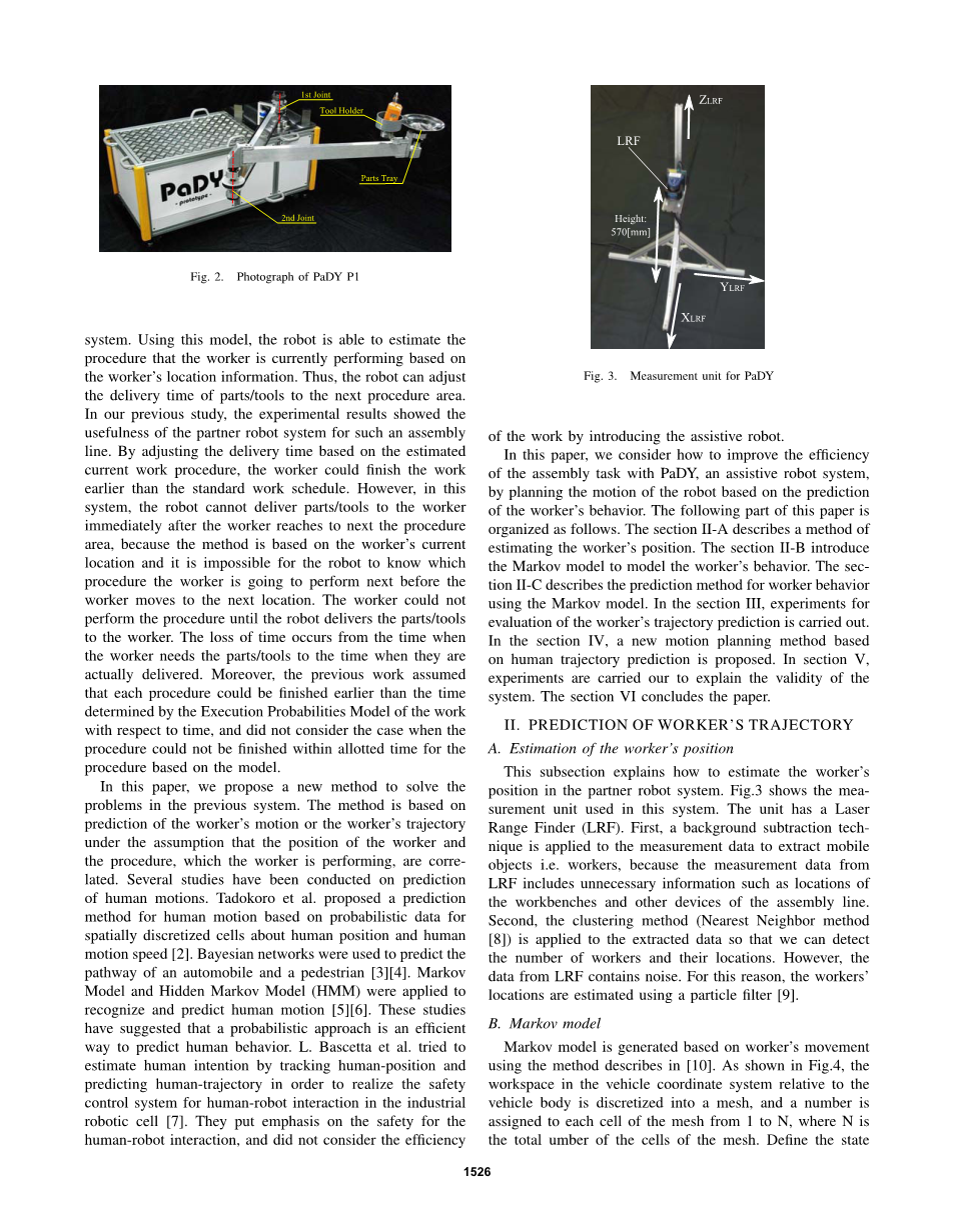 这个小节解释了如何估计工人在伙伴机器人系统中的位置。图3显示了在该系统中使用的测量单元。该装置有一个激光测距仪(LRF)。 首先,将背景减法技术应用于测量数据中,提取移动目标。即工人因为来自LRF的测量数据包括不必要的信息,例如工作台的位置和装配线的其他设备。第二,聚类方法(最近邻法)[8]被应用于提取的数据,以便我们可以检测工人的数量和他们的位置。然而,来自LRF的数据包含噪声。因此,工人的位置是估计的。特德使用粒子过滤器[9]。