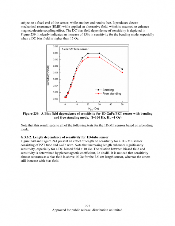 弯曲模式下金属丝连接在一个传感器的固定末端,而另一端则保持自由状态。当它被加上一个替代的场时就会产生电子机械共振(EMR),这被认为会增强磁电耦合效应。灵敏度对于直流偏置场的依赖性呈现在图239中。它清楚地表明弯曲模式的灵敏度增加了15%,尤其是当直流偏置场高于15 奥时。